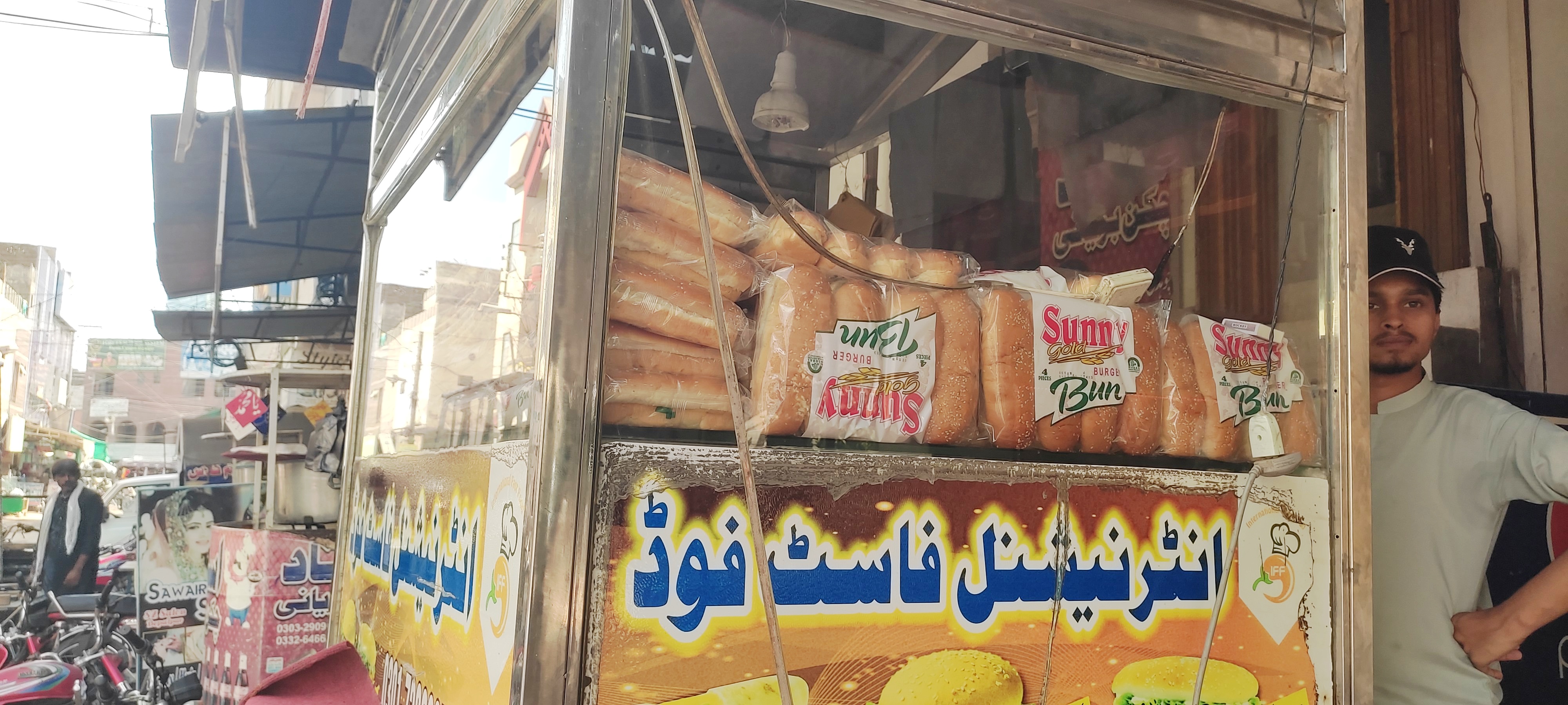 On the left side there is a fast food stall which have burgers, shawarma like fast food items. They have placed a number of fresh breads according to their daily usage in the counter. They bake fresh burgers and other fast food items in front of the customers.