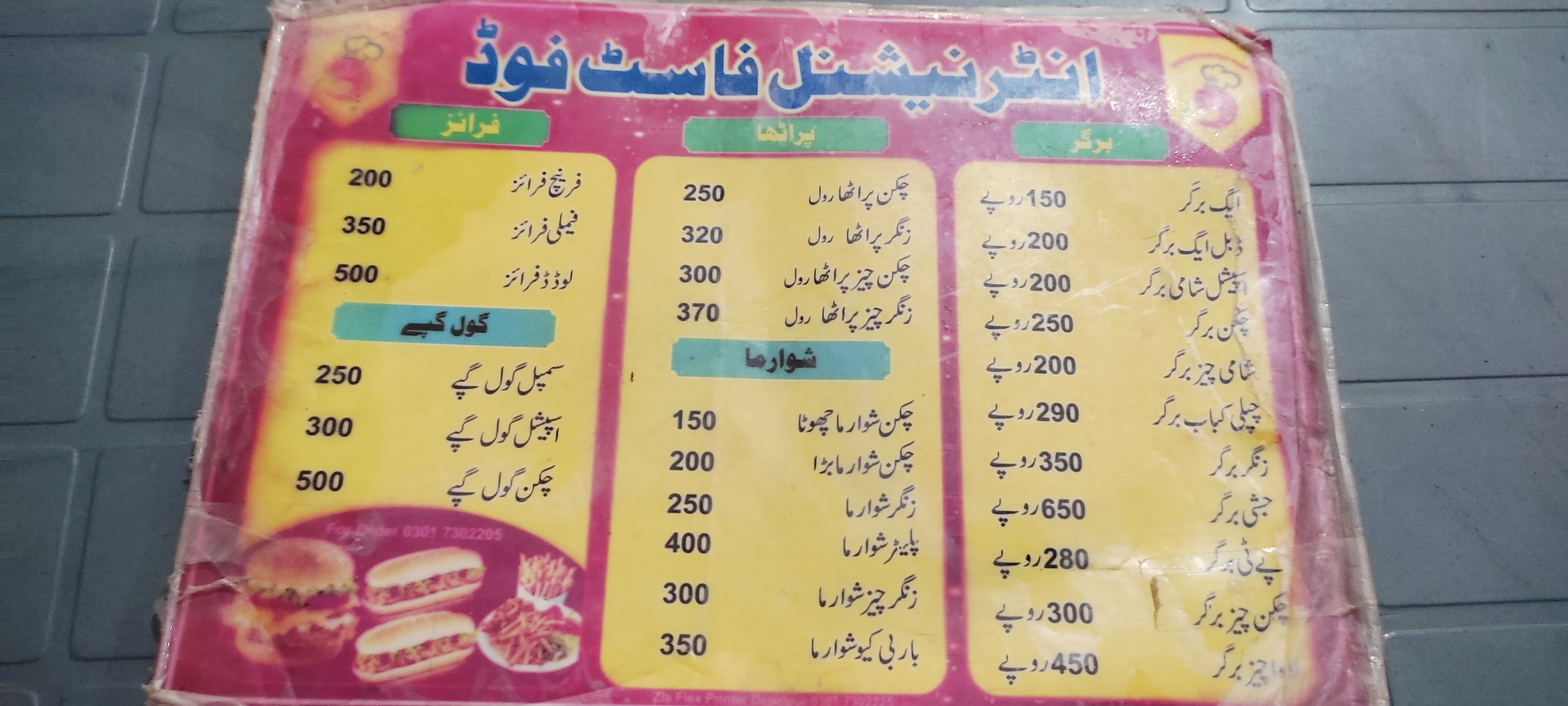 This is the menu card of International Fast Food point. They offer many products under their umbrella such as burgers, breads, shawarma, Goll Gappey and more varieties in them. The price of each item is mentioned before the name of the product. The customers can manage their budget before ordering anything. I noticed their prices were higher than some other similar standard fast food points.