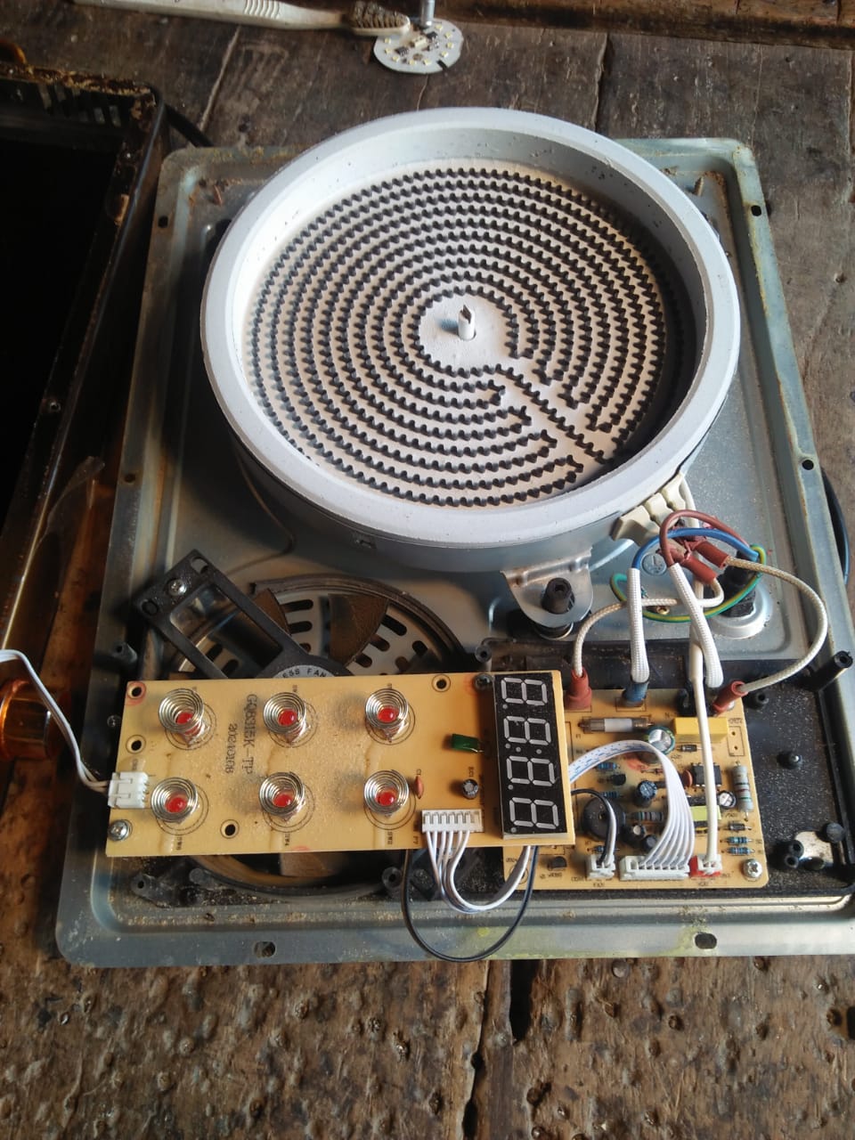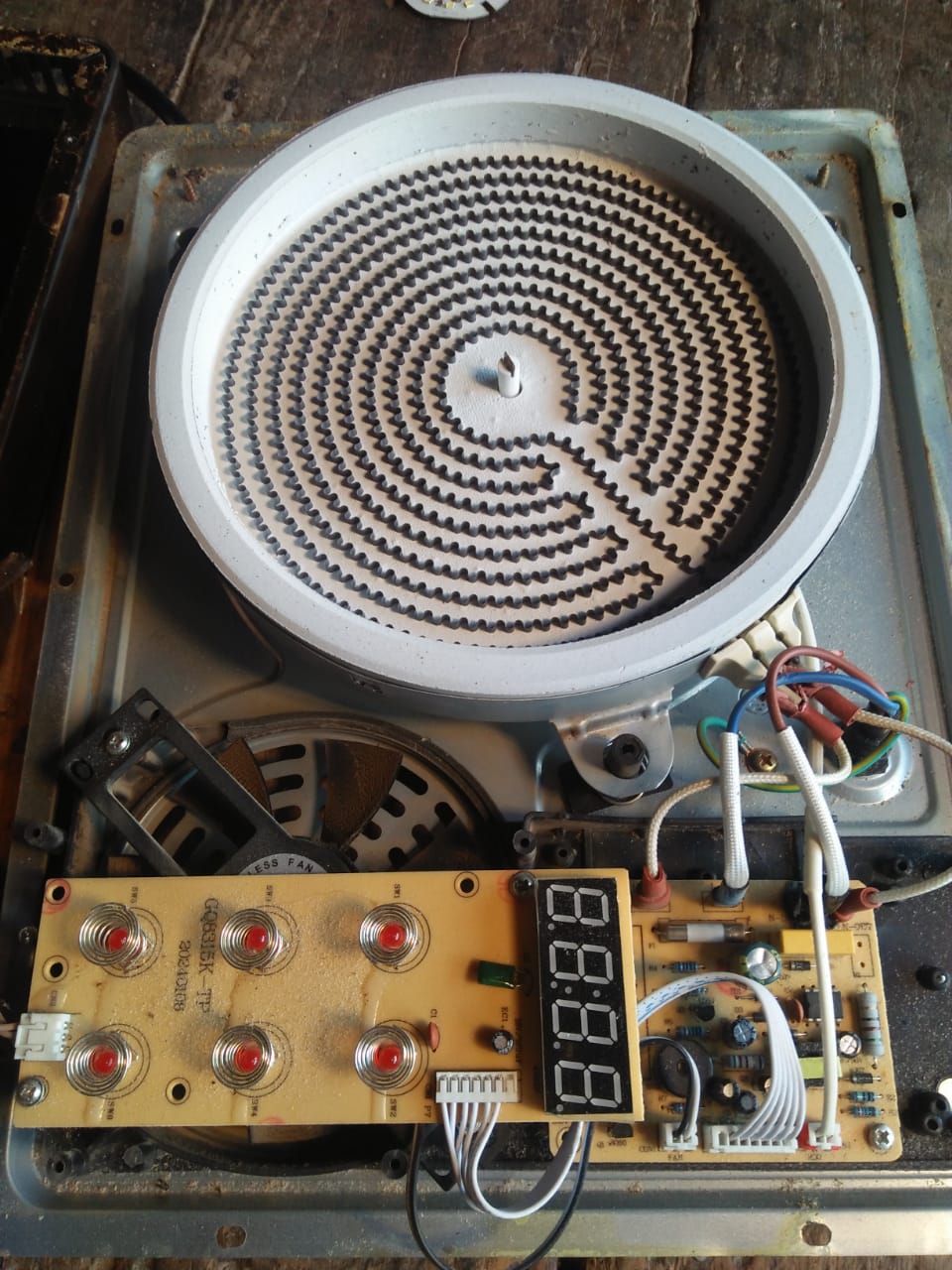Today I am going to share a hot plate with you guys. It came to me to be fixed. I opened it and took pictures of it so I can share it with you guys. This is basically an electric stove. It heats the pot through a heating system. It uses electricity, but it consumes less energy than ordinary stoves. A heating coil is placed underneath it, and a glass plate is placed on top, which heats up and heats the pot as well. It is powered by electricity and is intended for domestic use. This is the safest way to avoid gas, as we also have gas load shedding, so this is a very useful thing.