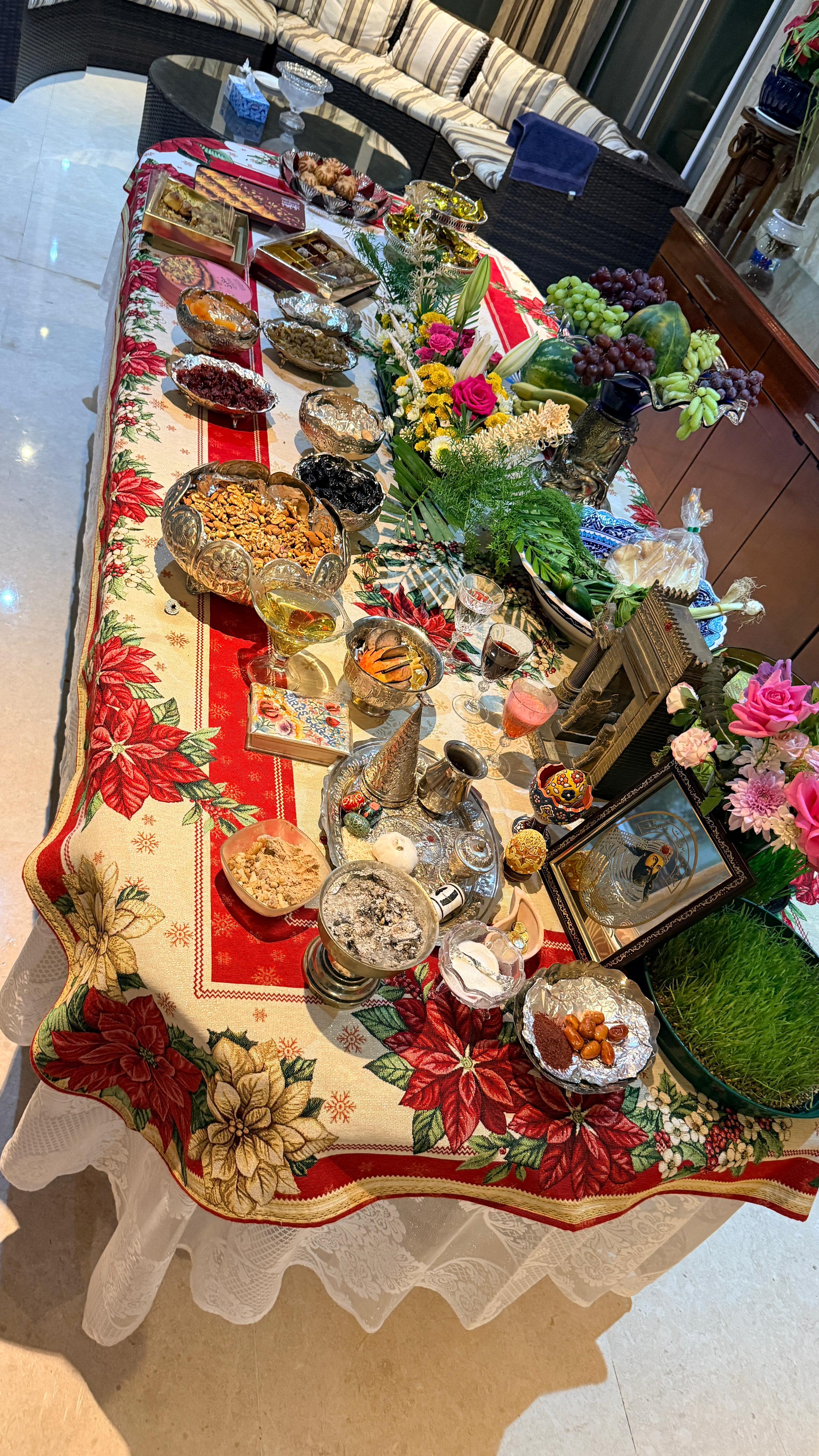As per the traditions a table is set with items of significance. This is the table that you see. Looks lovely. You can see there is food, there are some plants also, every item has some meaning to it. Nowruz signifies the start of Spring and new beginnings.