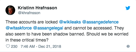 "These accounts are locked @wikileaks @assangedefence @wltaskforce @assangelegal and cannot be accessed," Hrafnsson recently tweeted. "They also seem to have been shadow banned. Should we be worried in these critical times?"