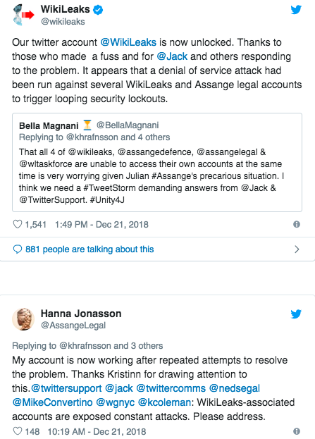 UPDATE: @WikiLeaks and @AssangeLegal are now unlocked.