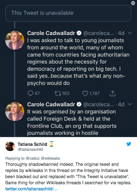 So in answer to Hrafnsson's question "Should we be worried in these critical times?", I think the answer is yes. Twitter has already actively helped shrink WikiLeaks' voice and facilitated fake accounts and disinformation by refusing to verify the account of Julian Assange back when he had unrestricted internet access, and it appears to now be censoring the entire organization. At a time when the Trump administration is known to be pursuing Assange's arrest, at a time when the now-Secretary of State has waged a war on WikiLeaks, at a time when narrative control has become a primary focus of the ruling power establishment as the US and its allies hurtle toward a military confrontation with Russia and/or China, yes, we should be worried. Very worried indeed.