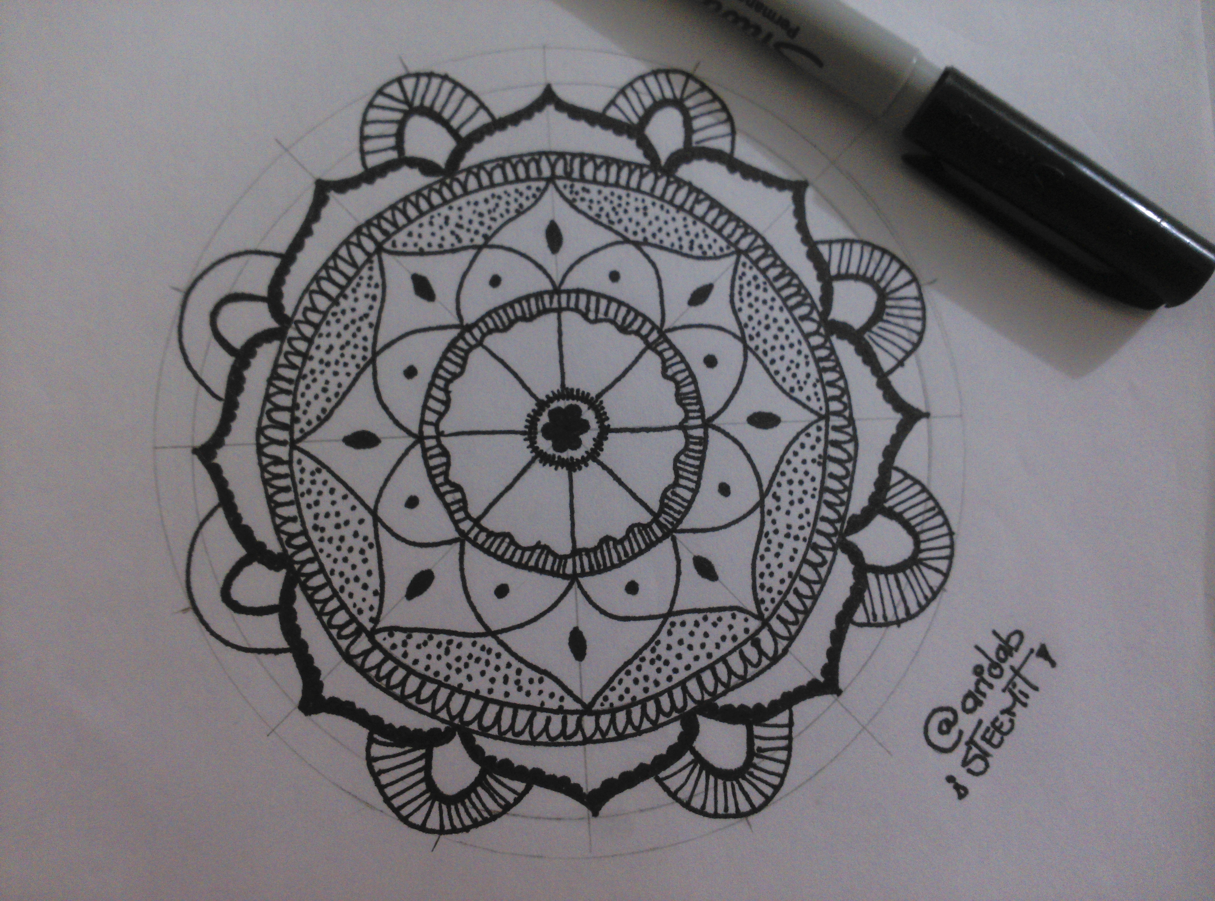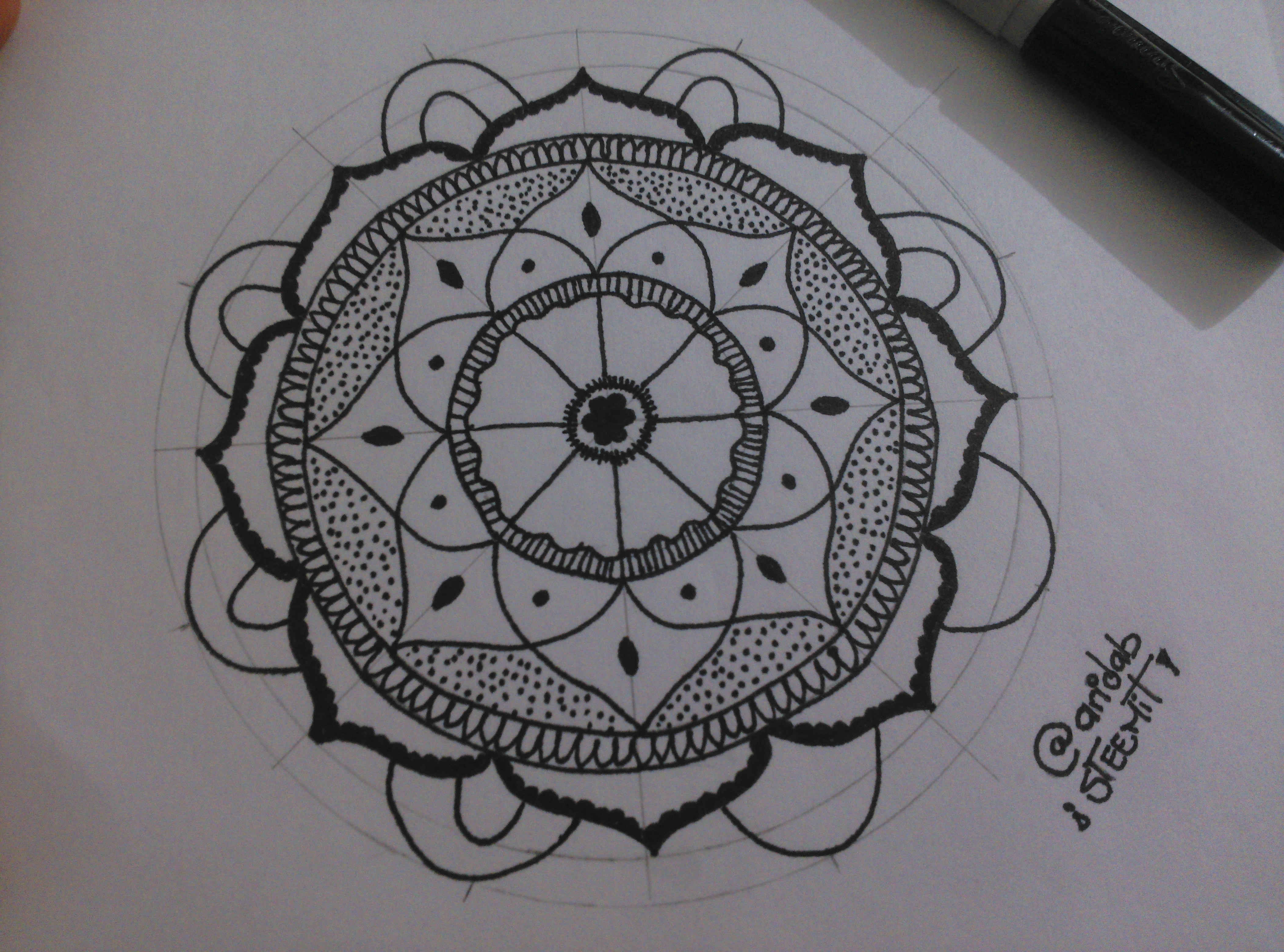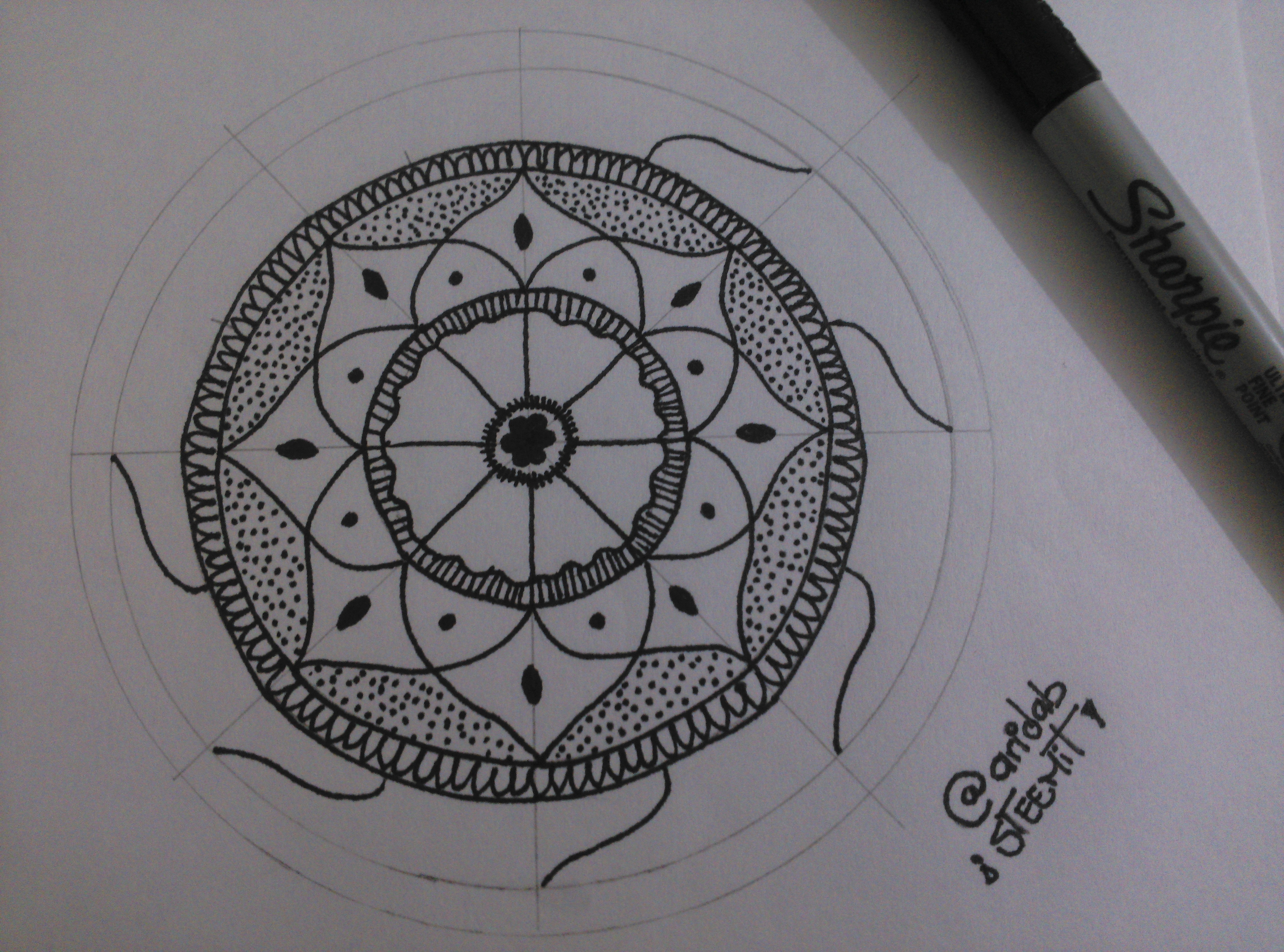 12.- Traza el círculo exterior y agrega unos espirales o arabescos alrededor. Y para terminar, puedes remarcar algunas líneas para darle un poco más de intensidad al producto final (yo remarque los pétalos).