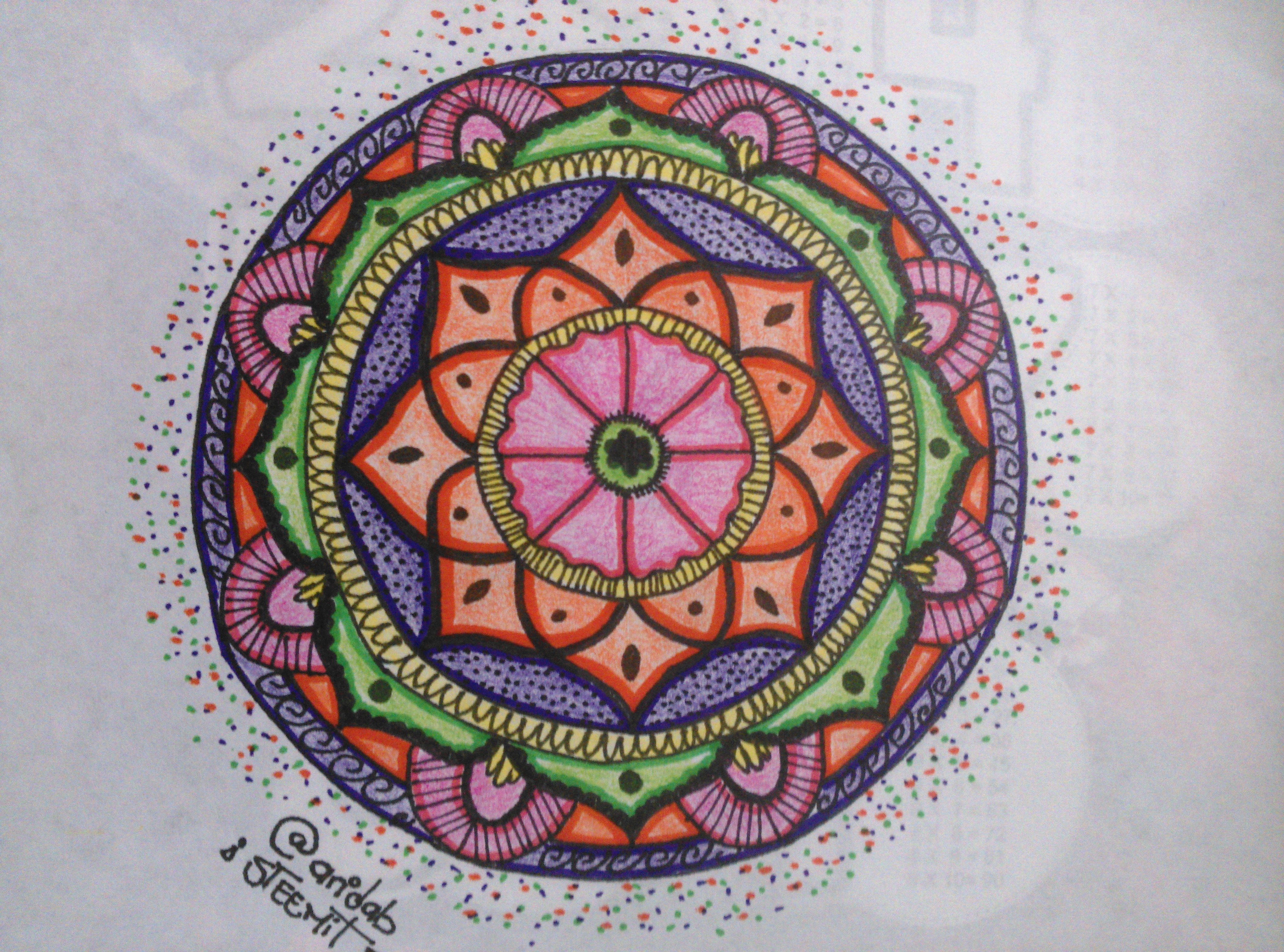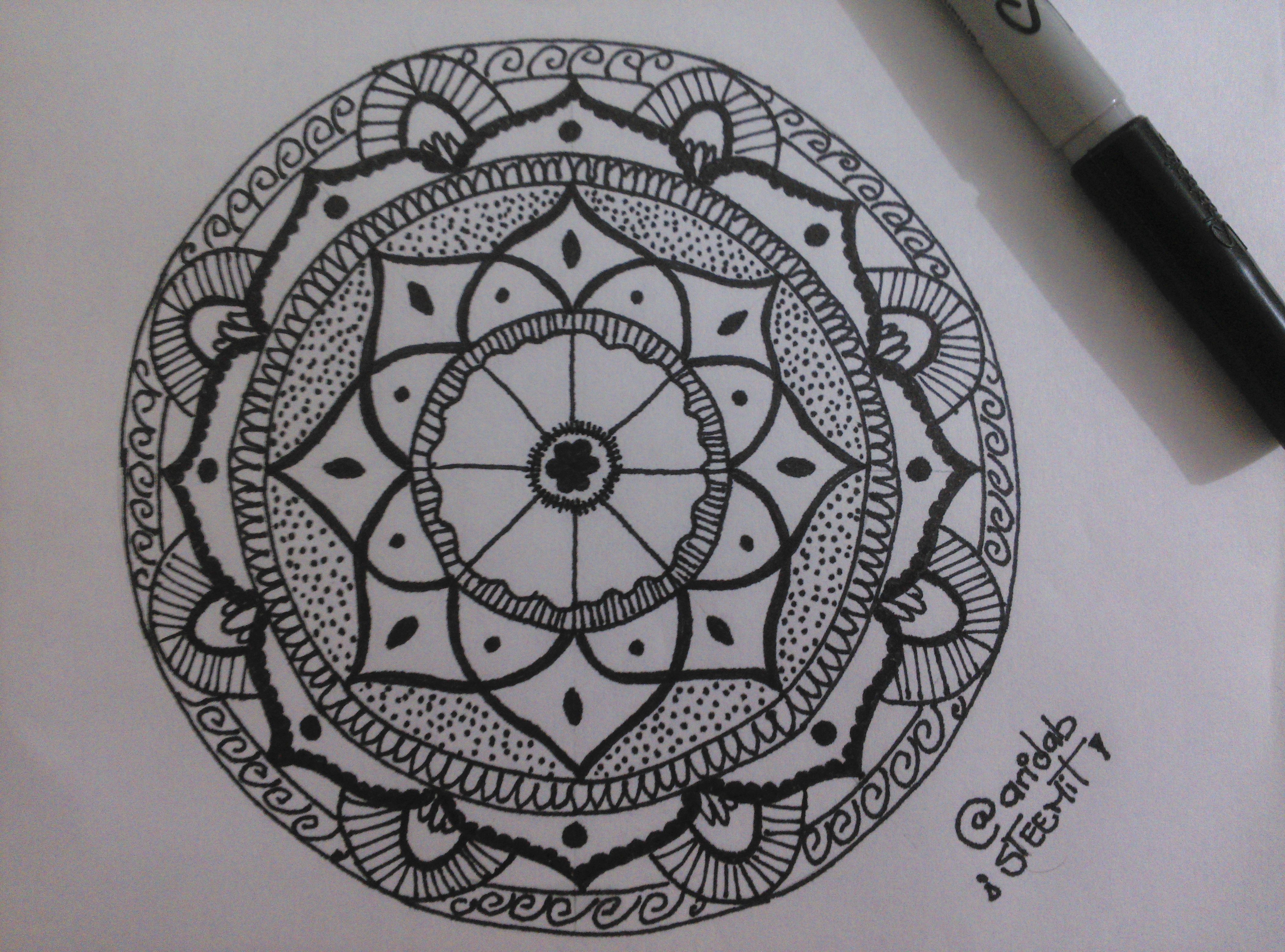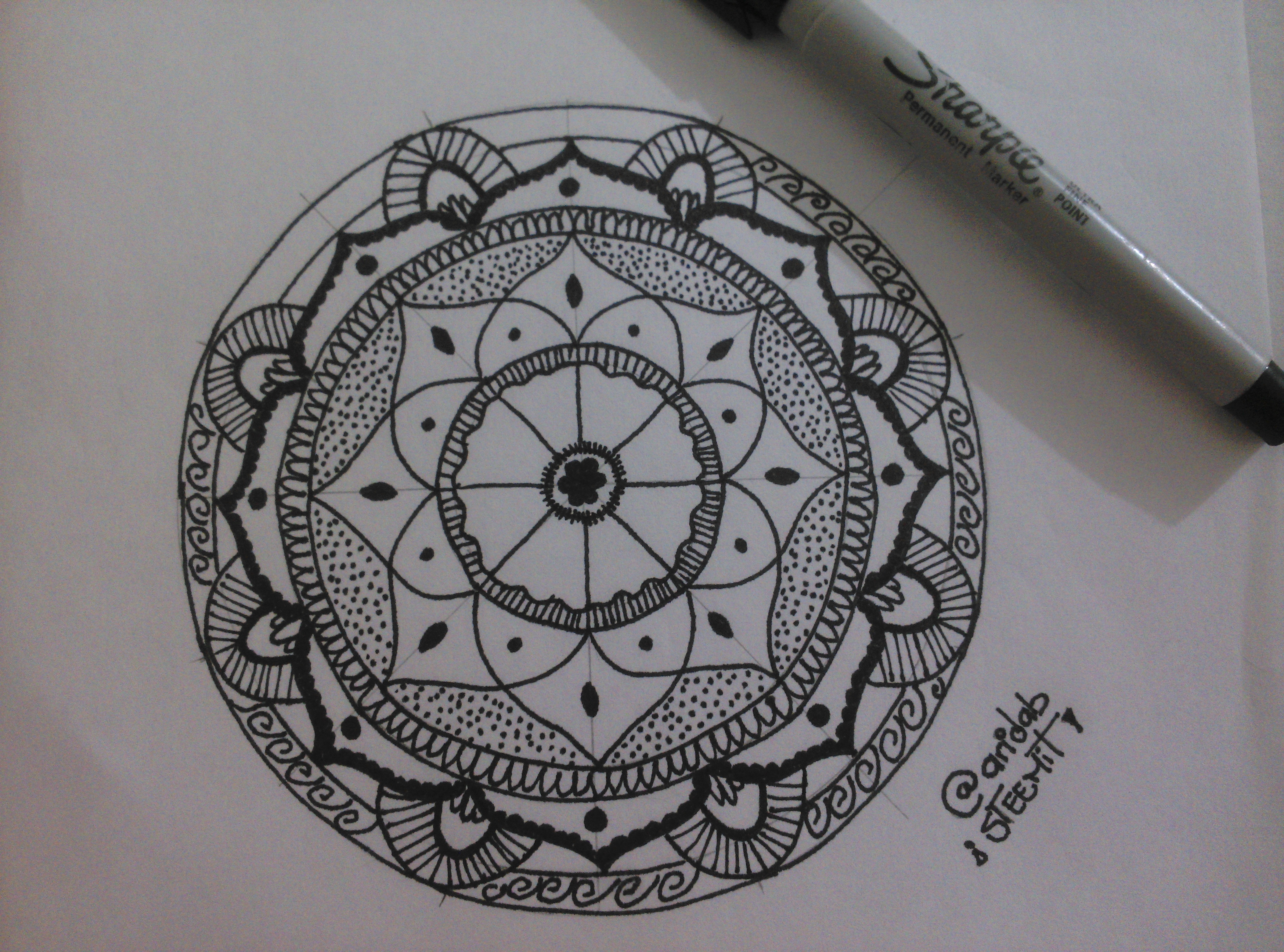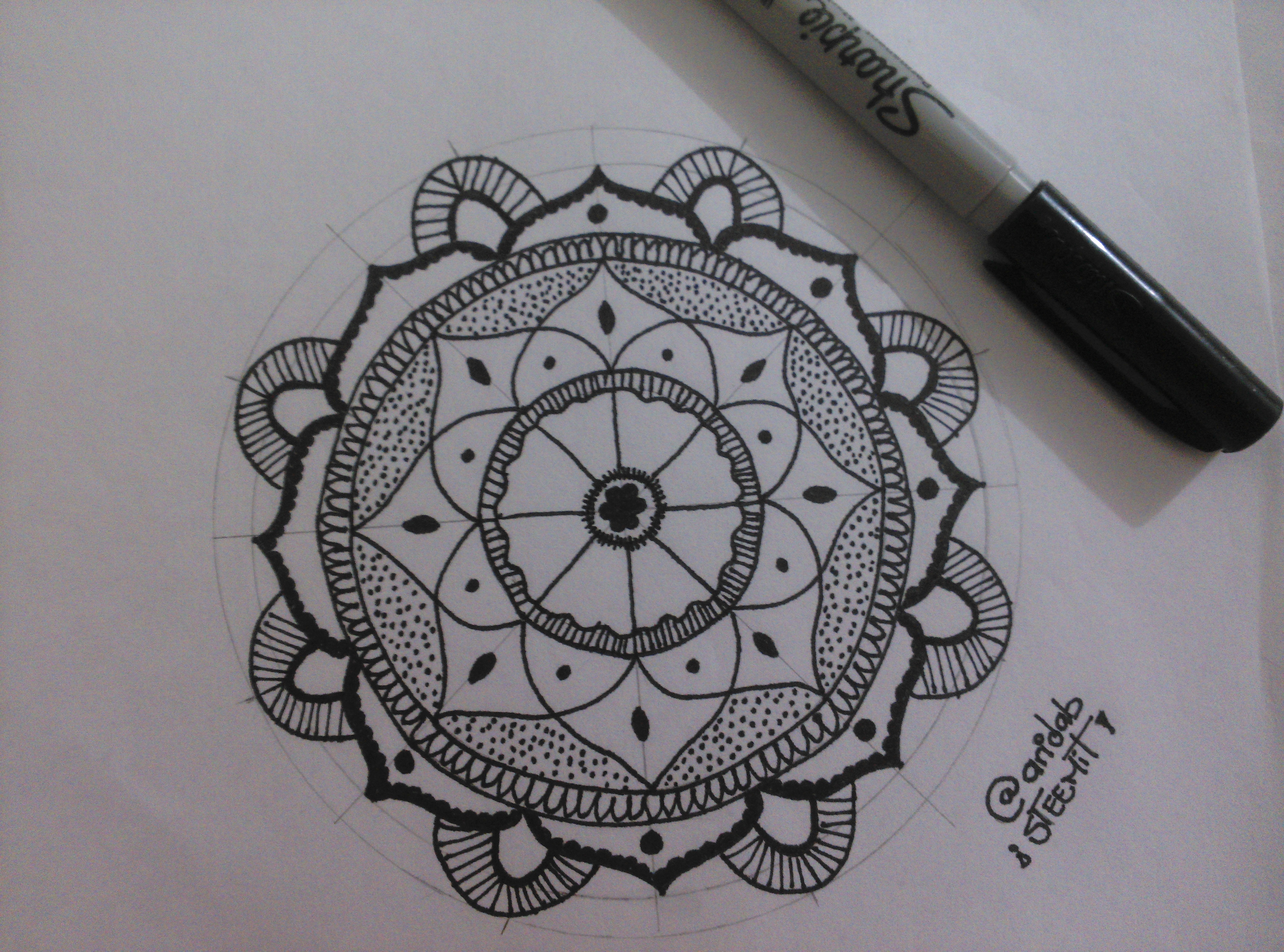 12.- Traza el círculo exterior y agrega unos espirales o arabescos alrededor. Y para terminar, puedes remarcar algunas líneas para darle un poco más de intensidad al producto final (yo remarque los pétalos).