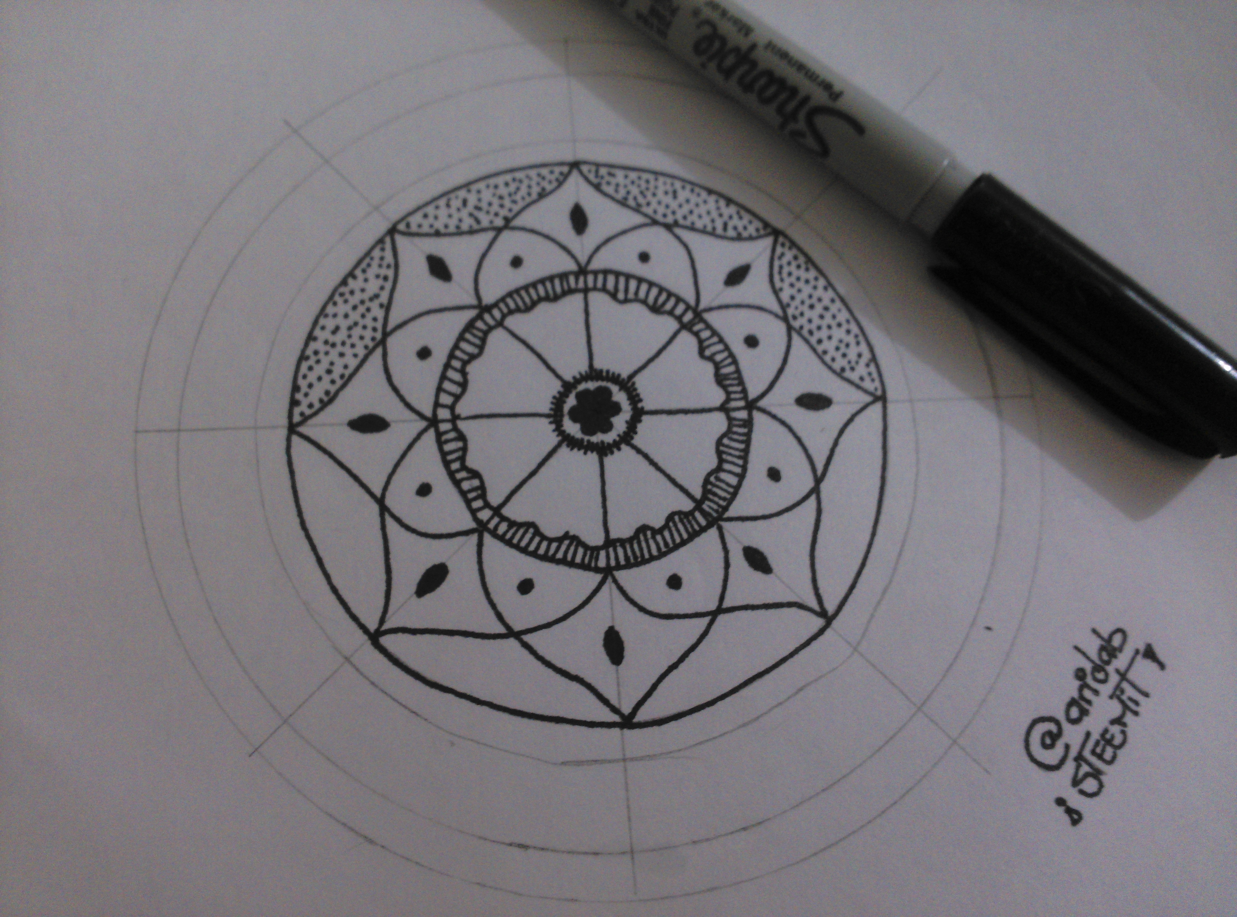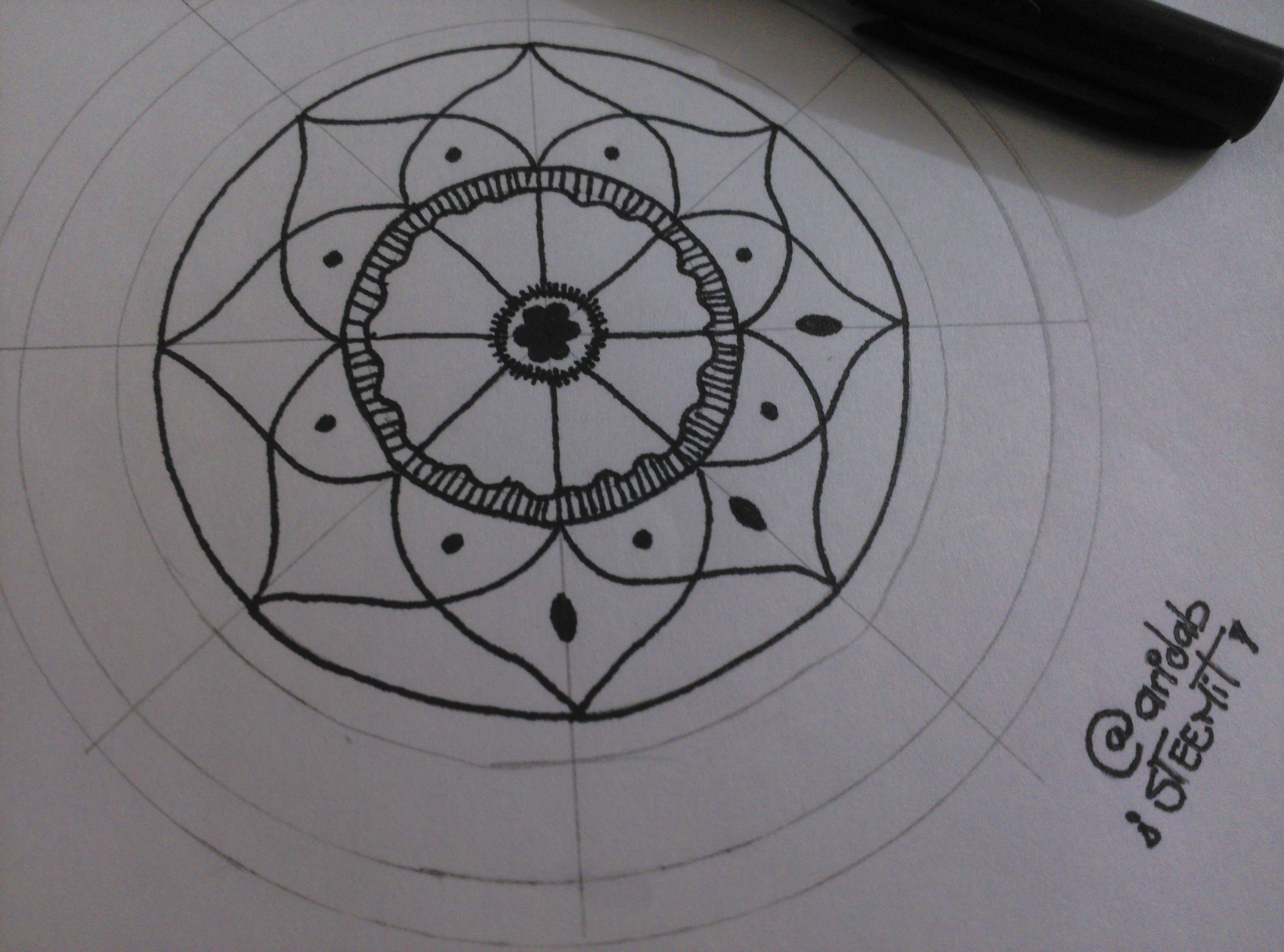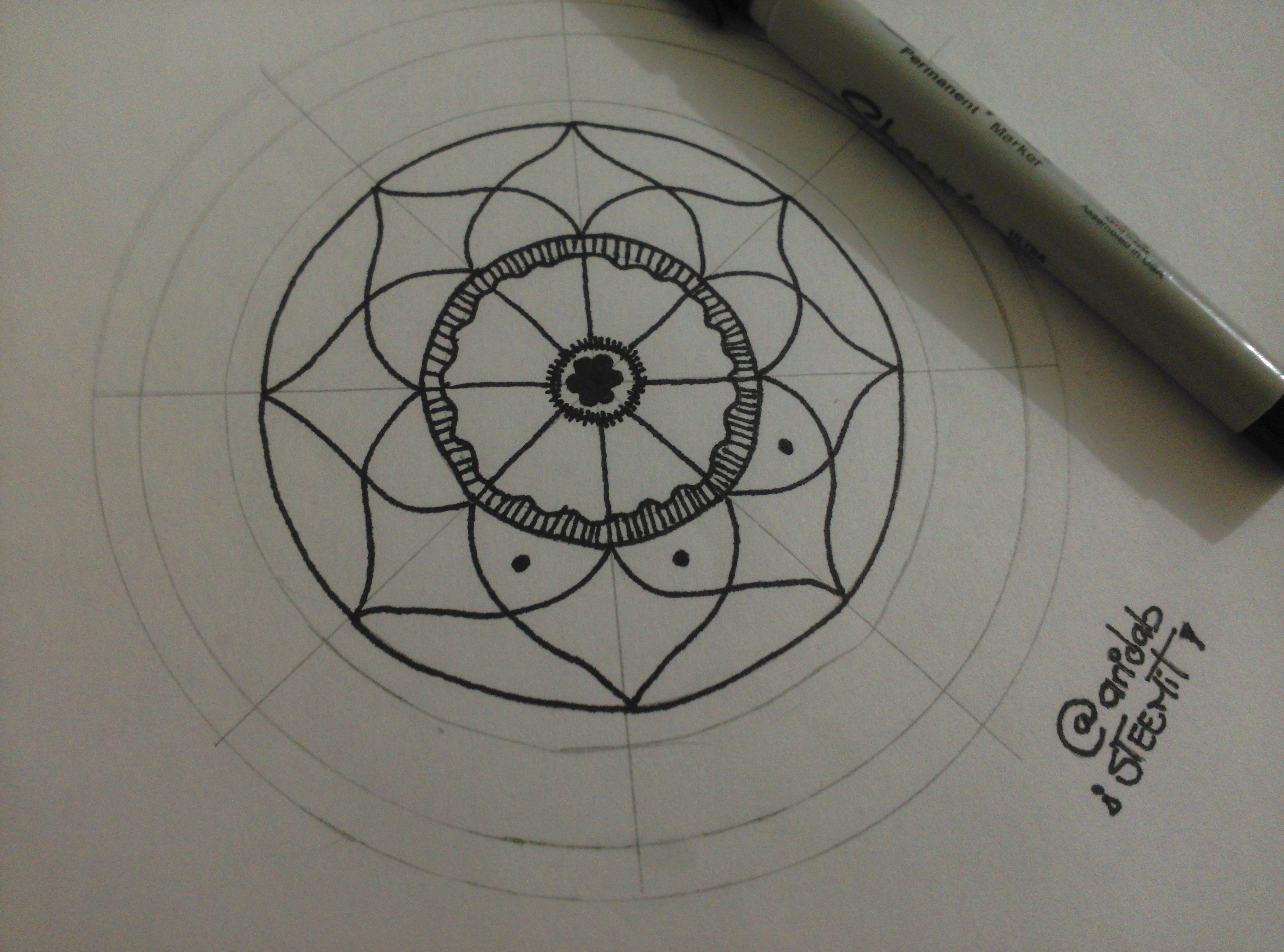 2.- Empieza el diseño con el marcador punta fina. Primero una figura central con unas líneas pequeñas al rededor y luego, en el otro círculo, una especie de pétalo utilizando como guía las líneas hechas a lápiz.