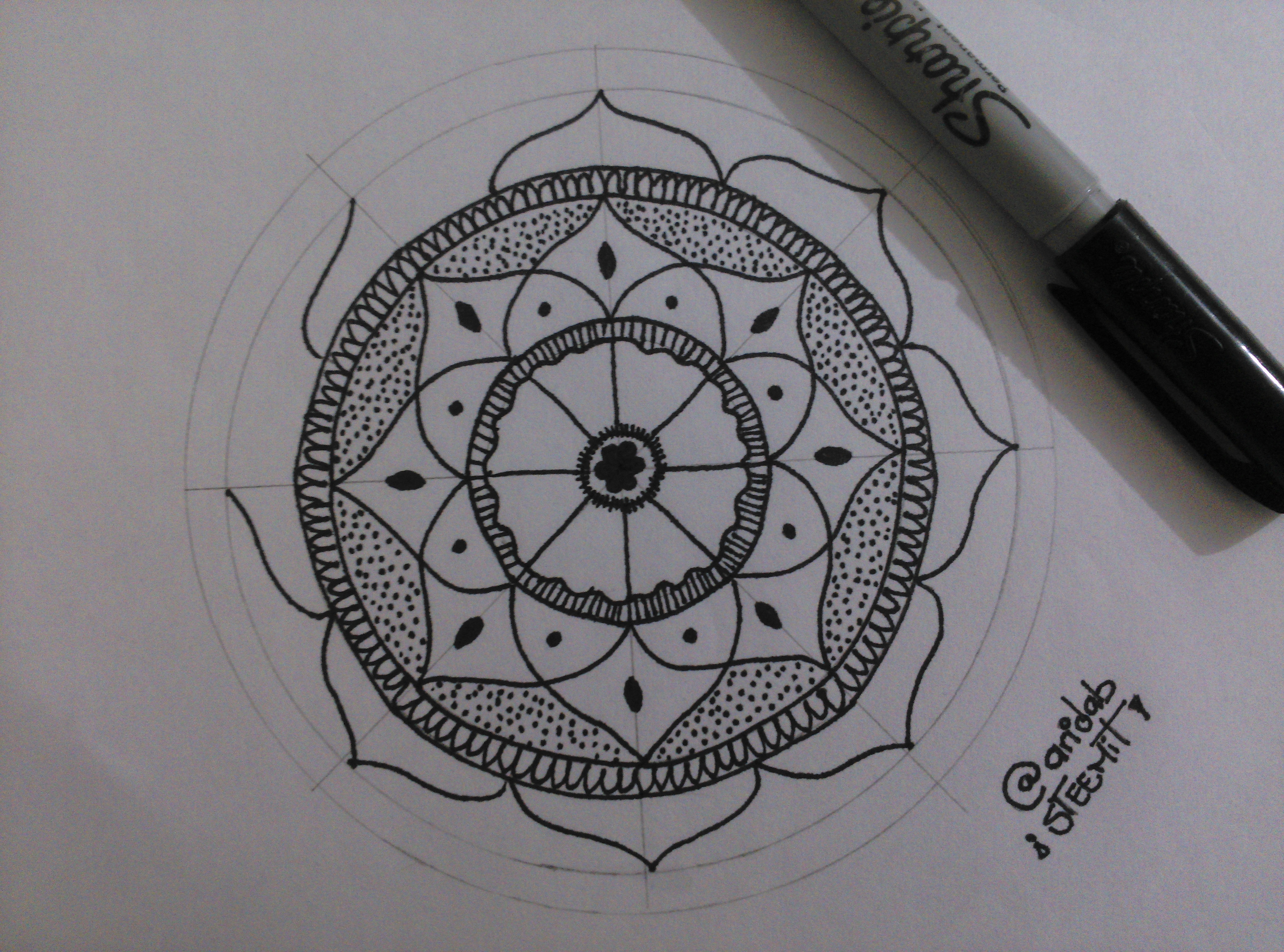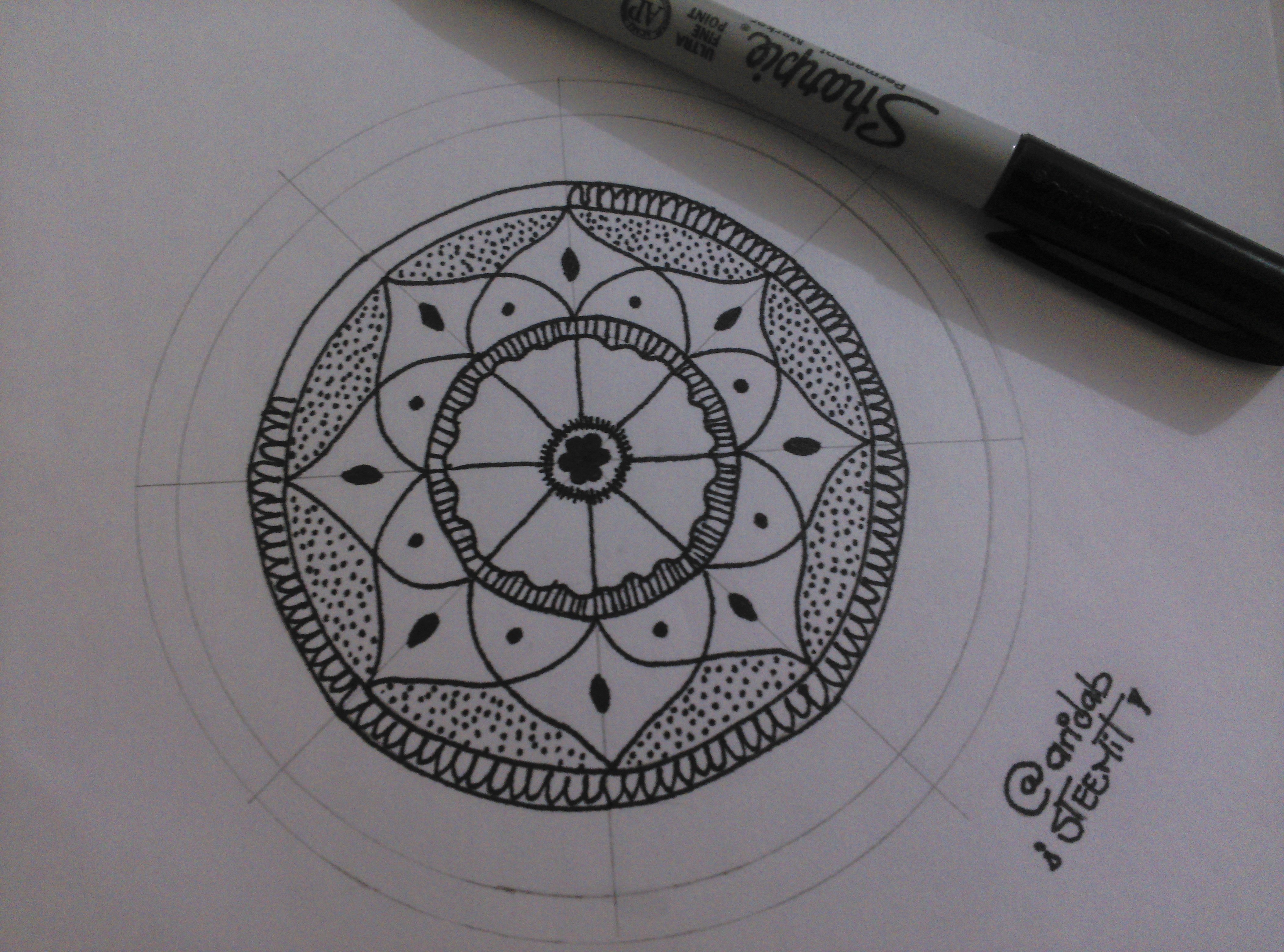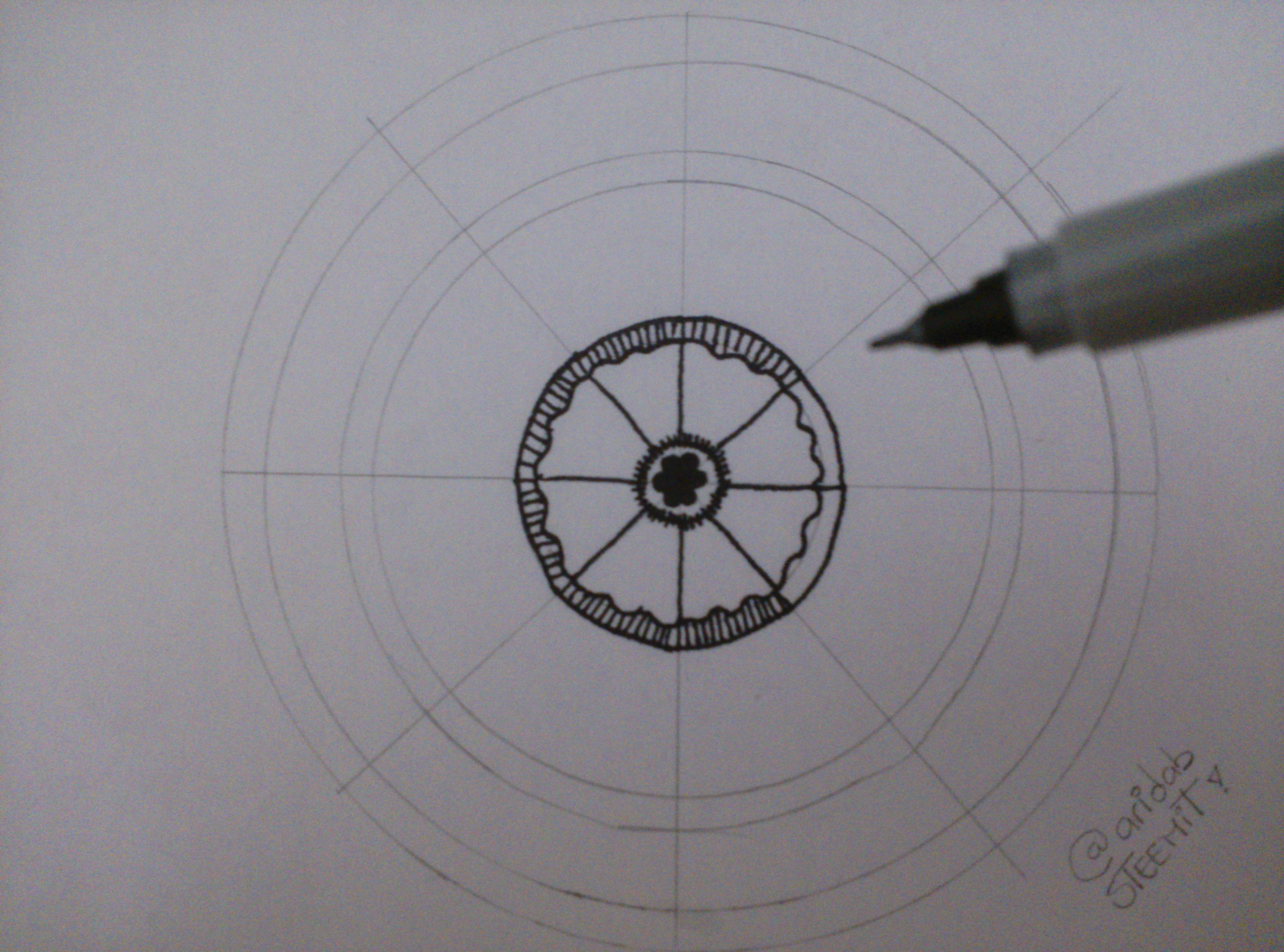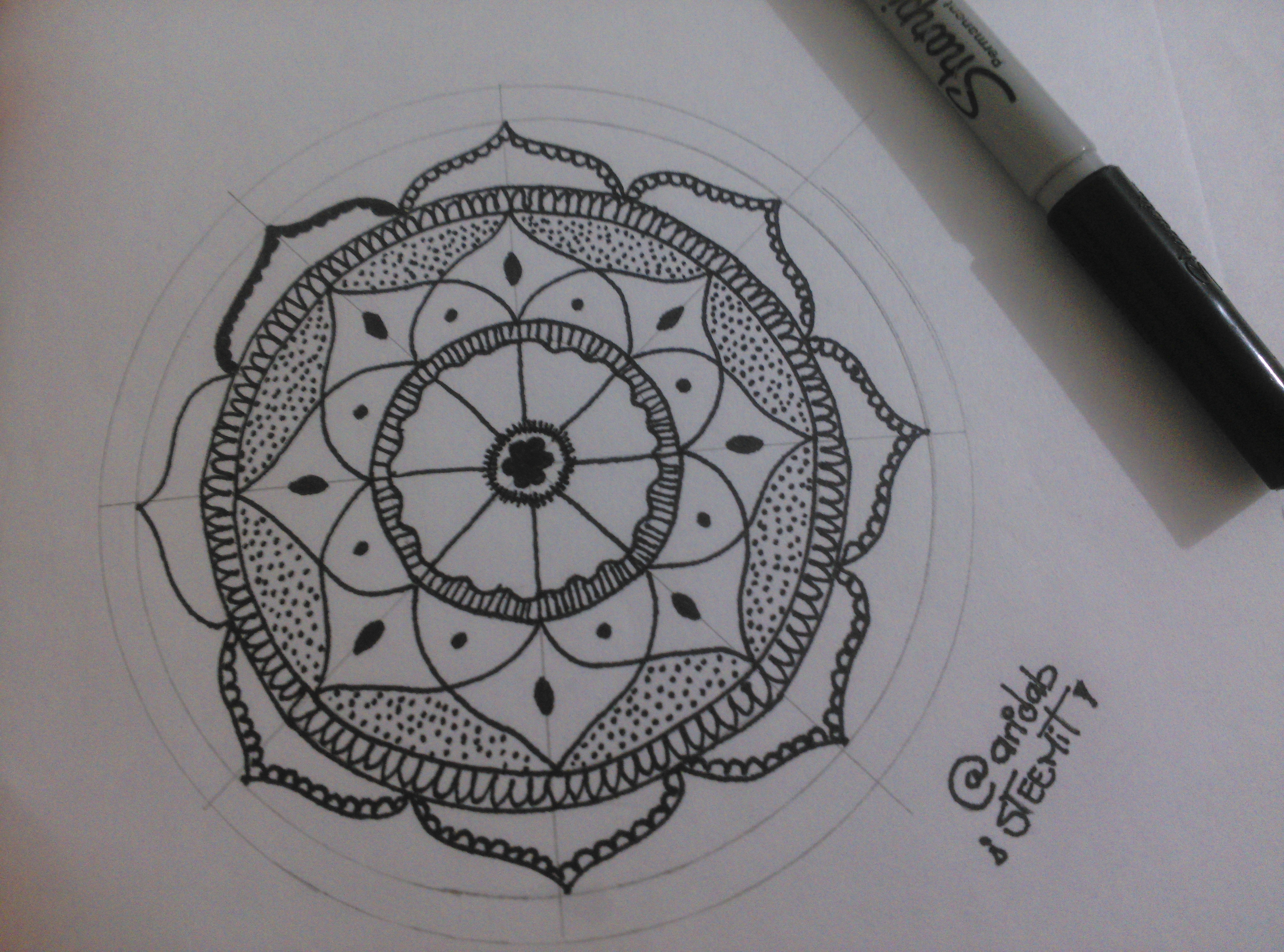 2.- Empieza el diseño con el marcador punta fina. Primero una figura central con unas líneas pequeñas al rededor y luego, en el otro círculo, una especie de pétalo utilizando como guía las líneas hechas a lápiz.