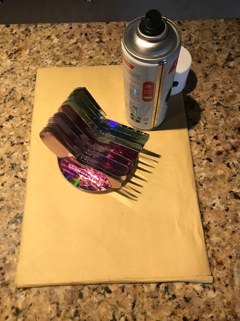 Luego, pegamos los CD a la base con la pistola de silicon, tomando en cuenta que se deje un espacio en el centro del CD base lo suficientemente amplio como para que pase el cable cargador, colocamos las 4 esferas en la base, pintamos y dejamos secar.