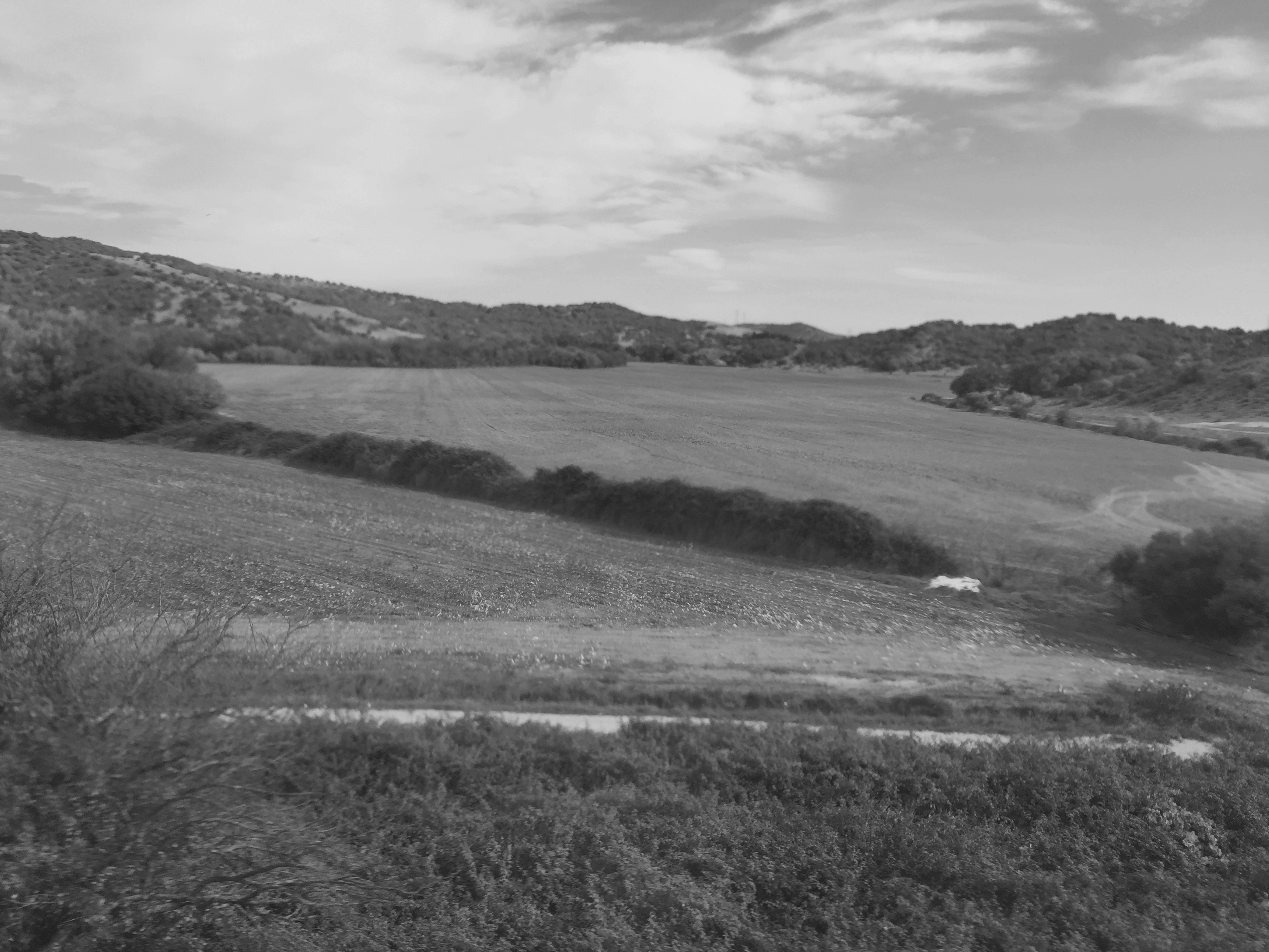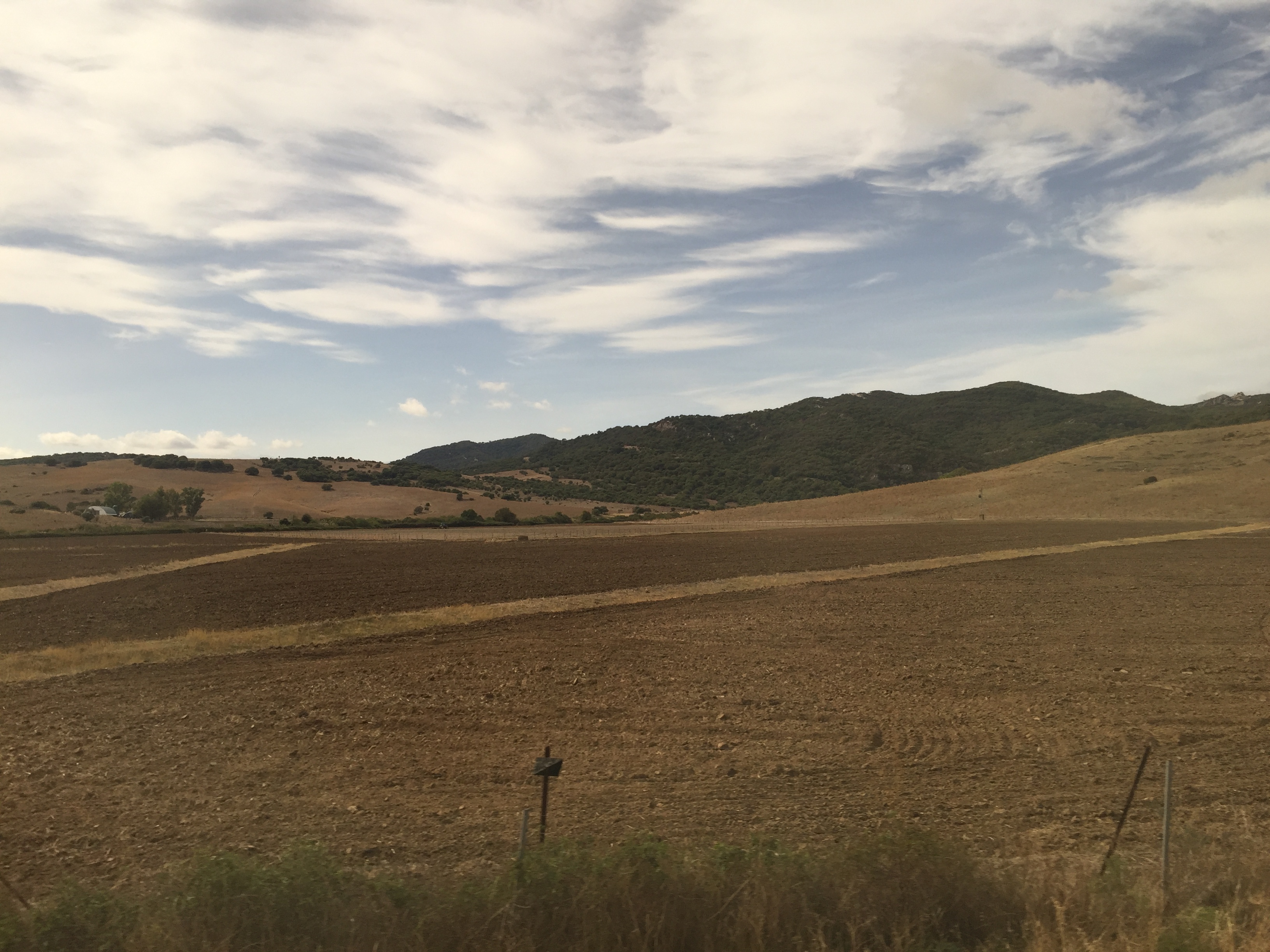Salimos de San Roque y los primeros paisajes son campos arados con cultivos de algodón y cítricos.