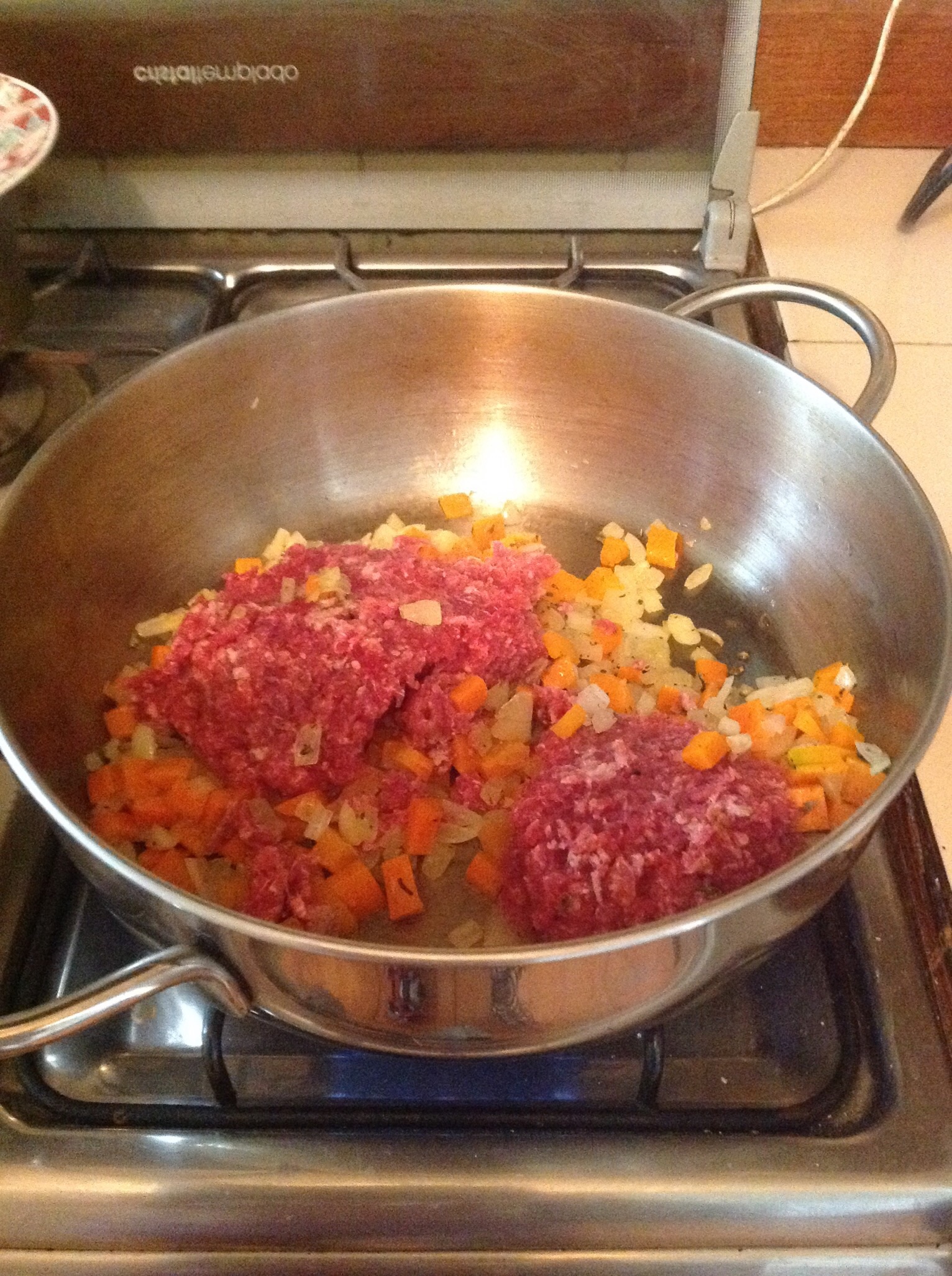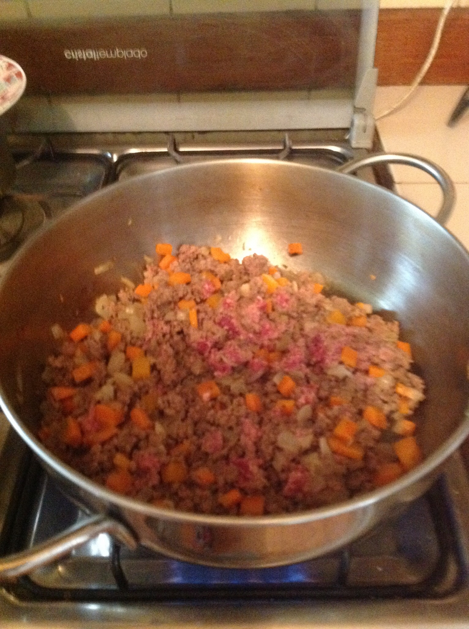 Agregar la carne molida y sofreír todo hasta que se suelte y cambie de color.