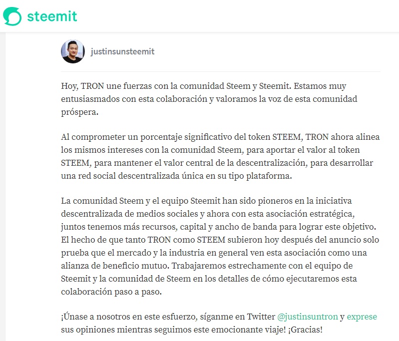 Pero hace unos días atrás, el 15/02/2020, el propio @justinsunsteemit publicó en su blog de Steemit la noticia sin muchos detalles: