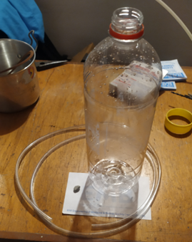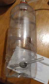 Por otro lado se toma otro trozo mas largo de la manguera y se pone en una botella cortada enrollandola en espiral y abriendo un hueco en la parte de abajo para que la manguera pueda salir, nuevamente se utiliza la masilla para sellar.