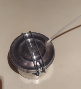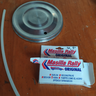 El procedimiento es realmente sencillo, primero en la tapa de la olla se abre un hueco para meter un trozo de la manguera (la he aislado un poco con teflón en cinta para evitar que se queme con facilidad) y con la masilla termica (conocida acá como RALLY) se unen y sellan fugas.