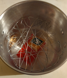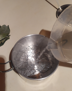 Ponemos la mesita de alambre dentro de la olla y agregamos agua de tal forma que no pueda tocar las plantas, encima de ésto ponemos las plantas (en mi caso usé hojas de eucalipto), sellamos la olla y la ponemos en la estufa para que el agua pueda hervir.