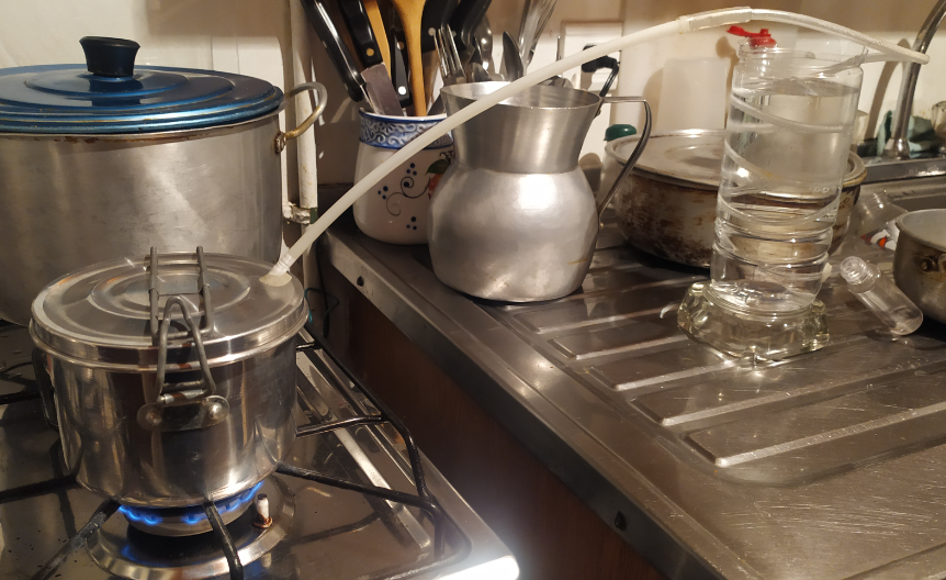 De esta forma tenemos un sistema que evapora el agua internamente en la olla y solo tiene una vía de escape, la cual es por la manguera en la parte superior, pero no sin antes atravesar las hojas de eucalipto y quitandoles su esencia.