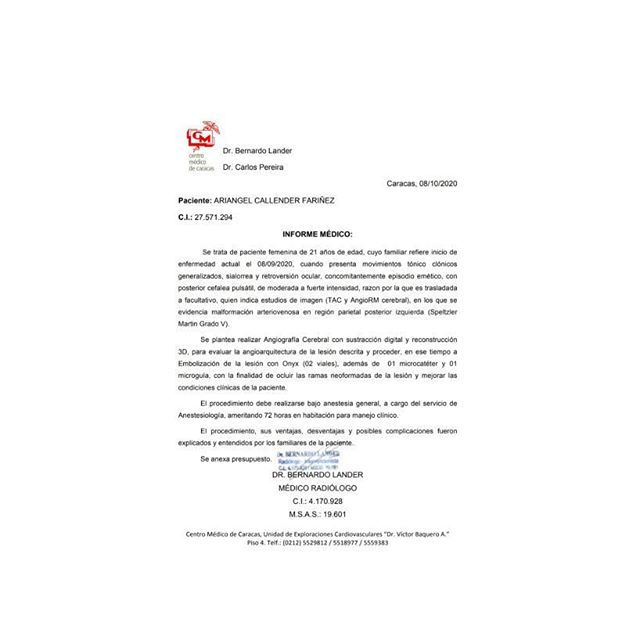 "Mi nombre es Ariangel Cllender Fariñez C.I 27.571.294. Tengo 21 años de edad, el pasado 8 de septiembre de este año me diagnósticaron una importante malformación arteriovenosa en el lado izquierdo de mi cerebro, tras haber tenido un ataque epiléptico. Los estudios que me realizaron para dectetar está enfermedad fueron una Tomografía cerebral