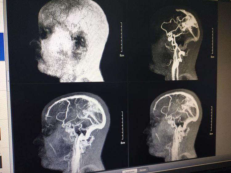 y una resonancia magnética con contraste igualmente en el cerebro. La malformación tiene un tamaño de 62.9 mm en diámetro vertical y 40 mm transverso.. Por lo que requiero realizar un tratamiento urgente antes de que vuelva a sangrar y pueda ocasionar un daño mucho más grave.