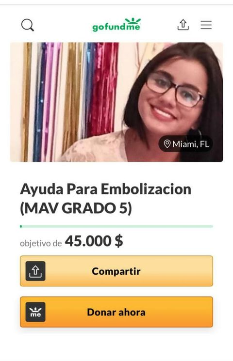 Les pido de todo corazón una ayuda para poder realizarme el tratamiento principal que es una embolización cerebral. Actualmente cada sesión tiene un costo muy elevado que no puedo cubrir. Yo necesito por lo mínimo unas 5 sesiones por lo grande de la Malformación. Ayúdenme por favor. Todavía tengo esperanzas de vida, que Dios los bendiga."