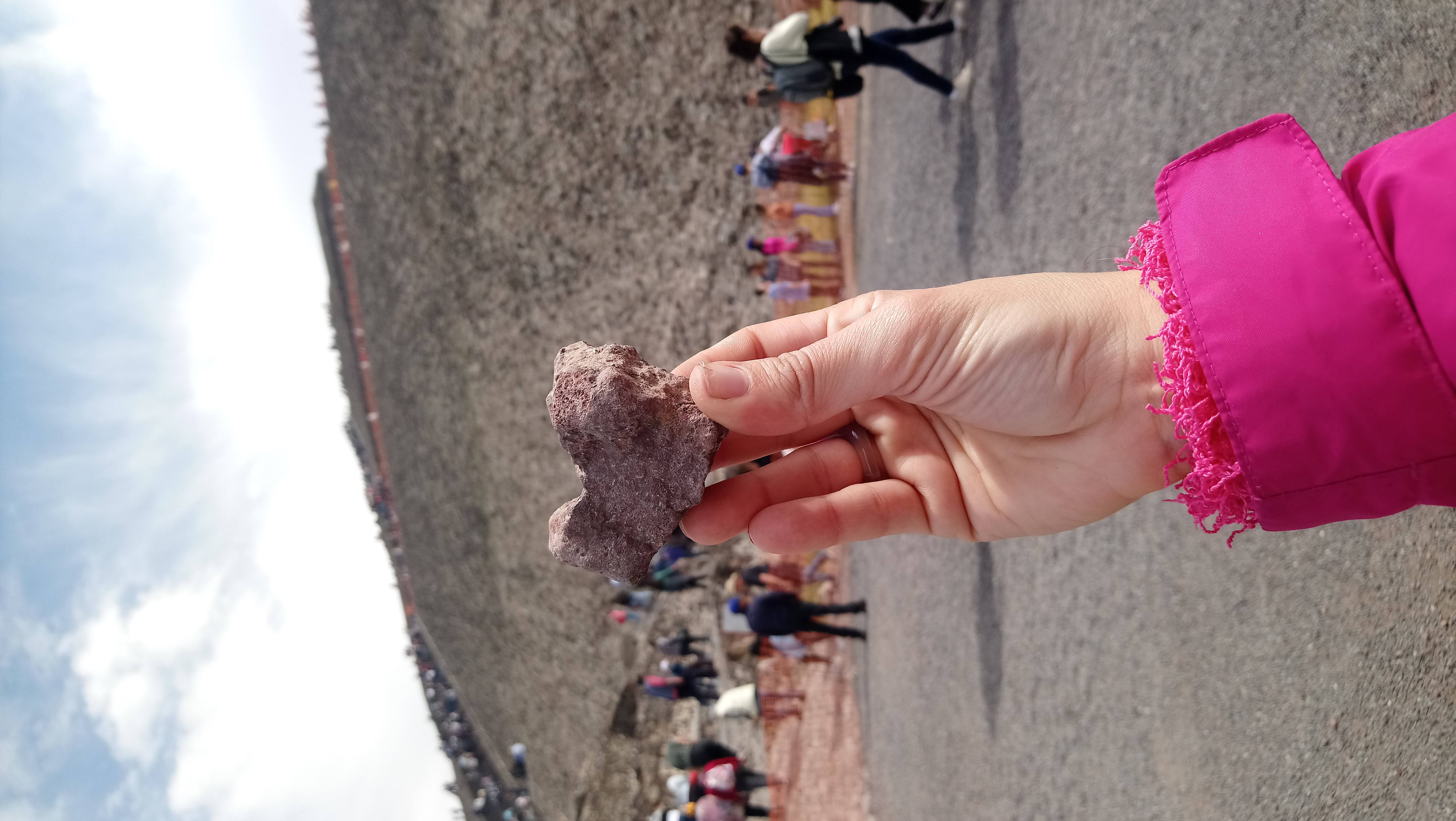 En la cima de la pirámide del sol, en su punto más alto hay un agujero donde la gente se aglomeraba para cargarse de energía. La piedra se dejó encontrar y por lo tanto iba a irse conmigo, me la llevé al instante de estar en el punto más alto, y agradecí con una sonrisa cumplir ese sueño.