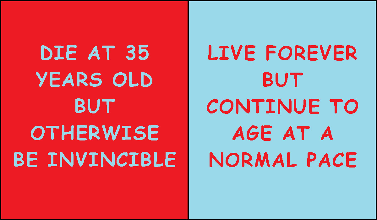 MMmm... I can only get freaked out by pain and suffering a 200 year old body would be in and not die. Still 35 is way to young to die and besides thats around the age you start thinking your not invincible anyway so your not really offering an upgrade. Alright I guess there is always morphine to kill the pain. I'll take live forever and regret it later.