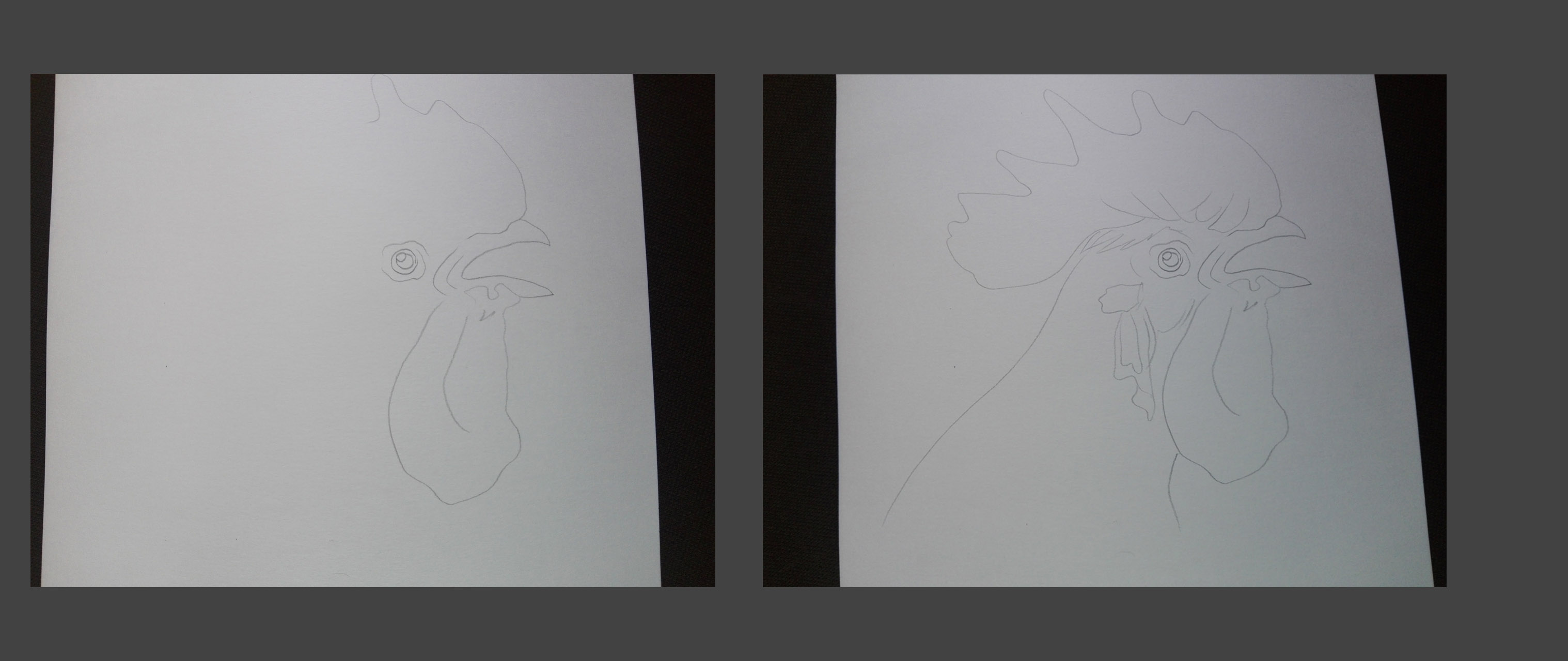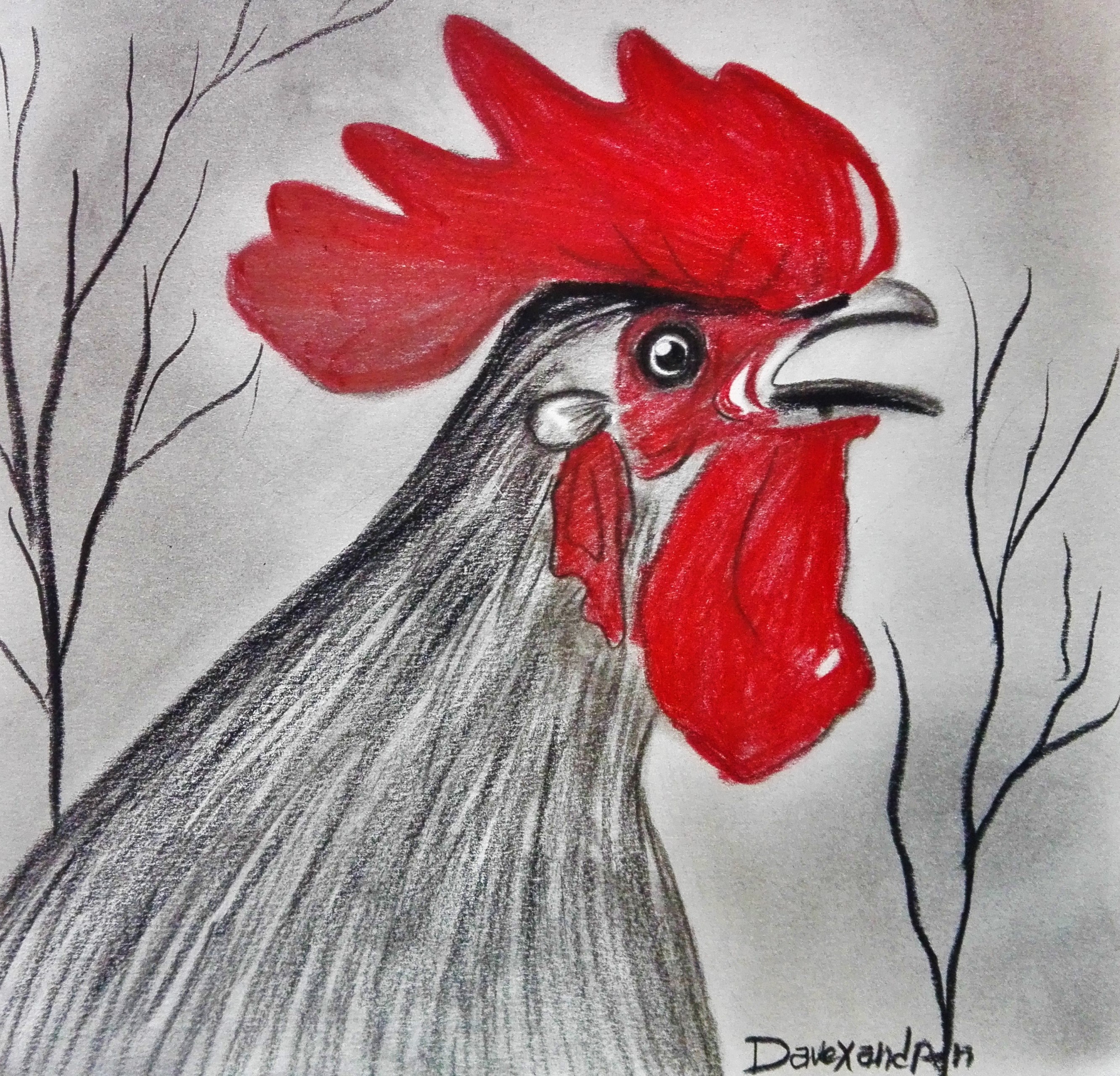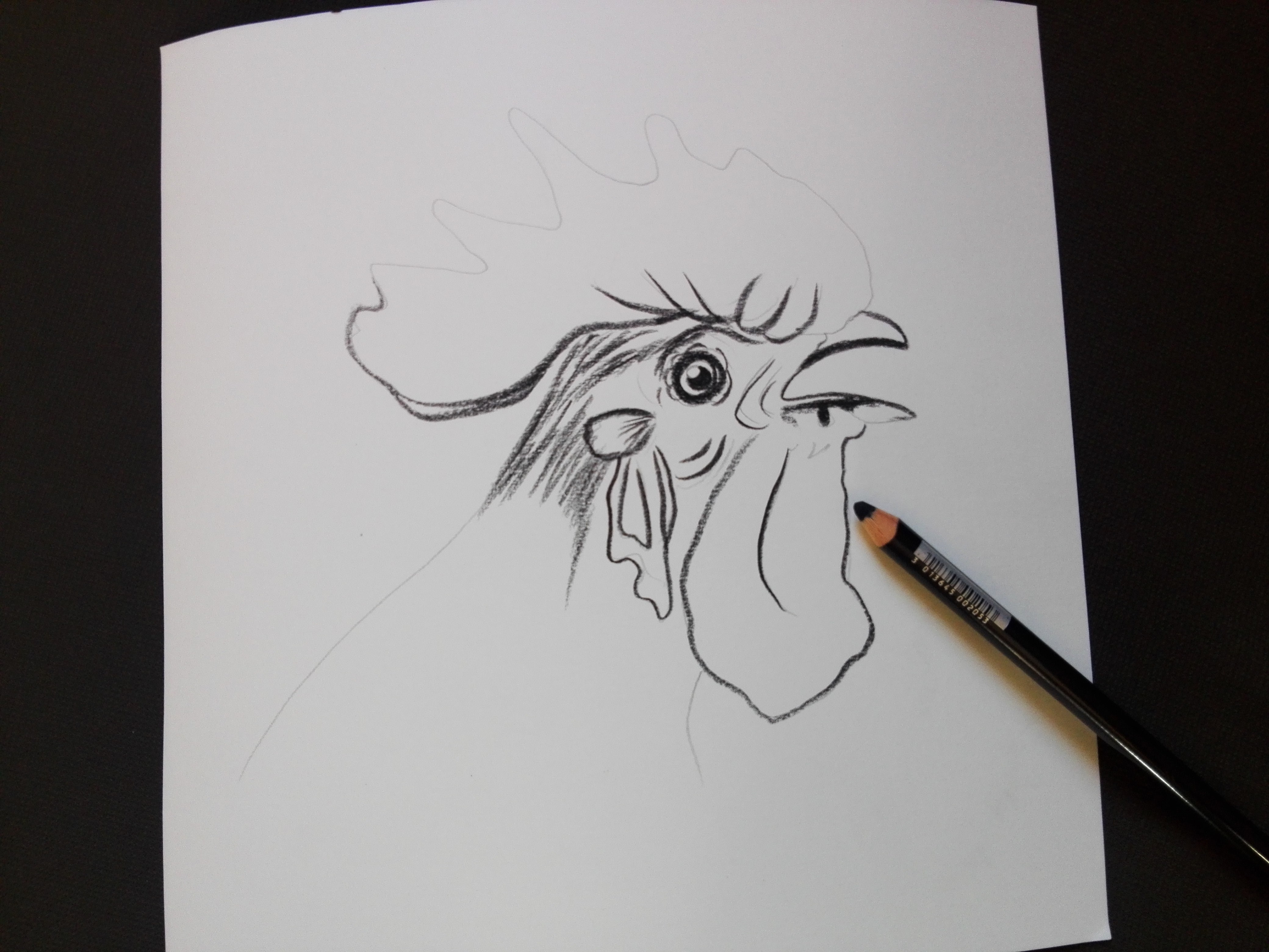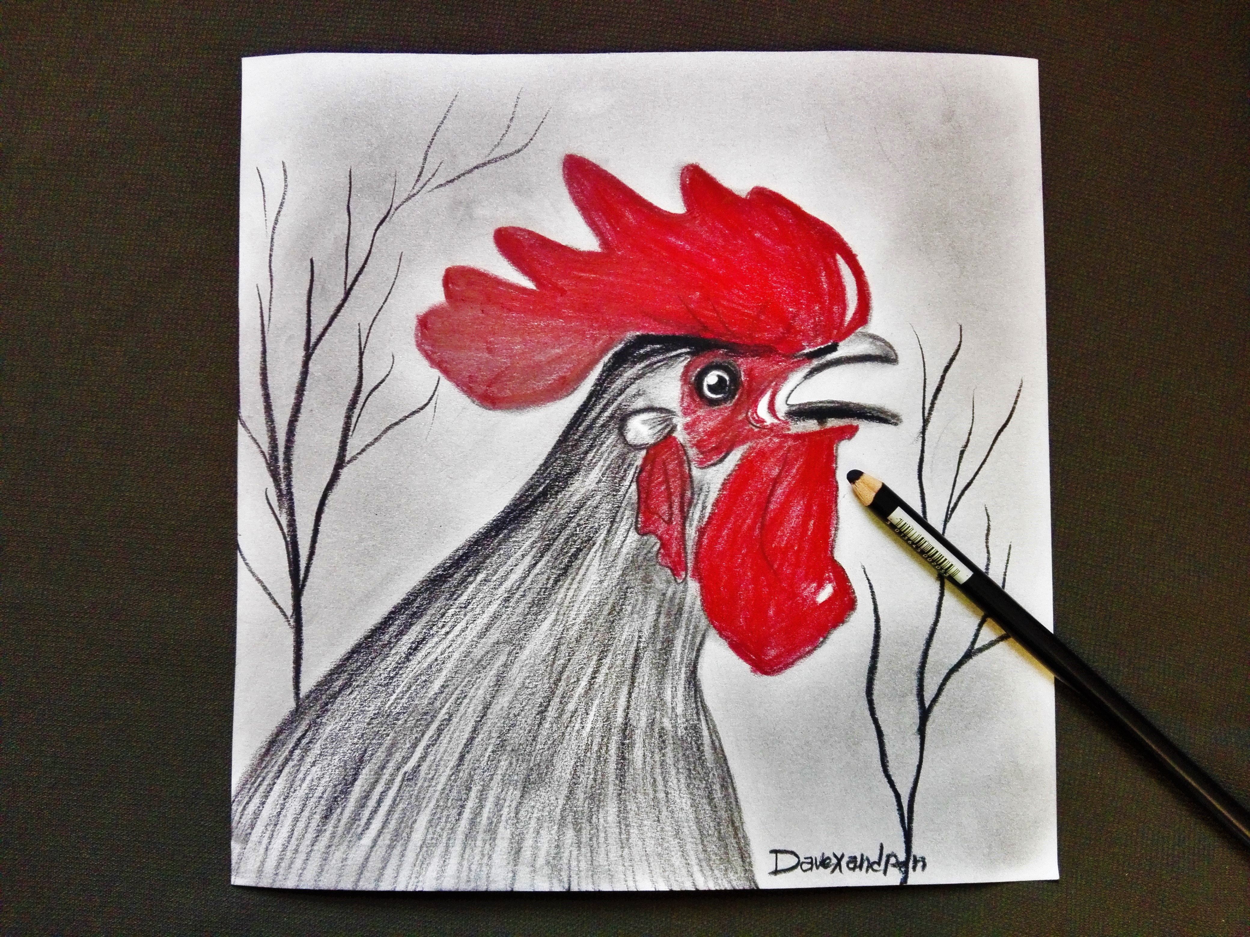 Hello , a rooster who is singing with charcoal pencil on paper