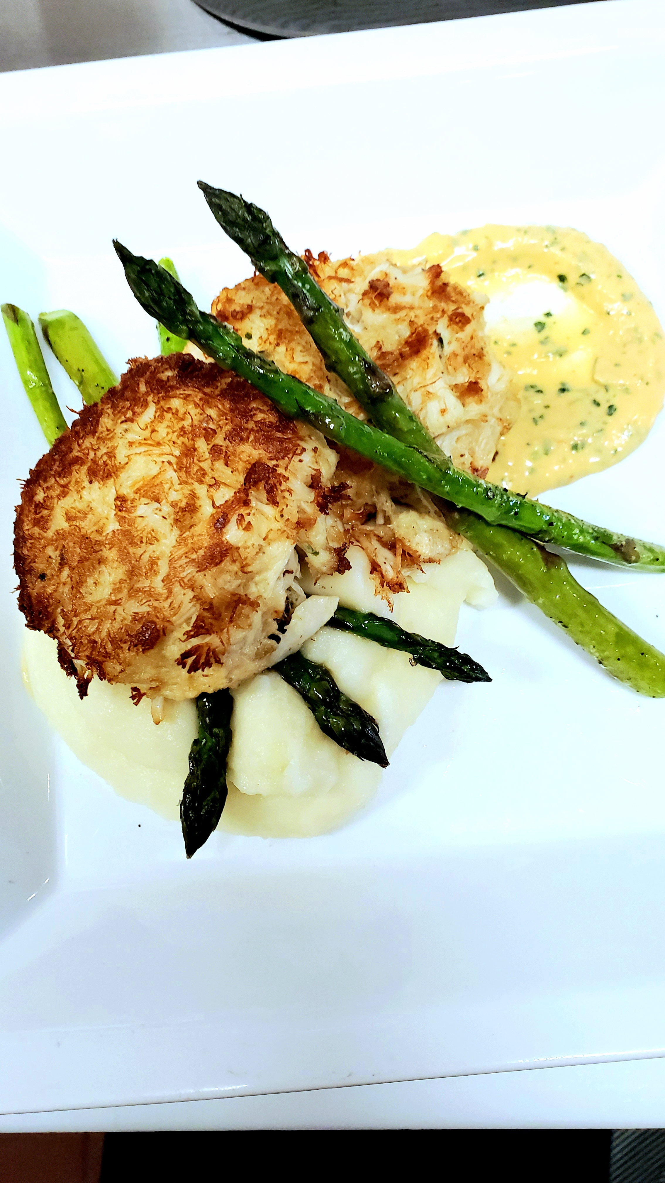 I could go on about a 3 page rant about what most places do wrong with crabcakes. If you ever order crab cakes and split one open and can't tell theres crab in their its for a good reason. Most places use about 60% filler mainly Panko or Italian bread crumbs and 40% crab meat. Its a disgrace in my opinion. Its called a crab cake for a reason. We prefer to use jumbo lump crab meet. It doesnt break down so much and get stringy. Dump all that into a mixing bowl, an ok size spoon full of mayonnaise, dijon mustard, a squeeze or two of fresh lemon juice, chives, maybe a dash of old bay if youre feeling daring, and an egg. Mix all off that together, then slowly toss in Panko untill the mixture starts to tighten up(maybe a cup or 2 depending on how much crab, maybe less)and you can form a ball with out it just falling apart. Wrap, refrigerate for an hour to let it set. Then portion, I like using an icecream scoop, makes doing large batches quick and easy. We served ours with a remoulade, roasted asparagus and whipped potatoes.