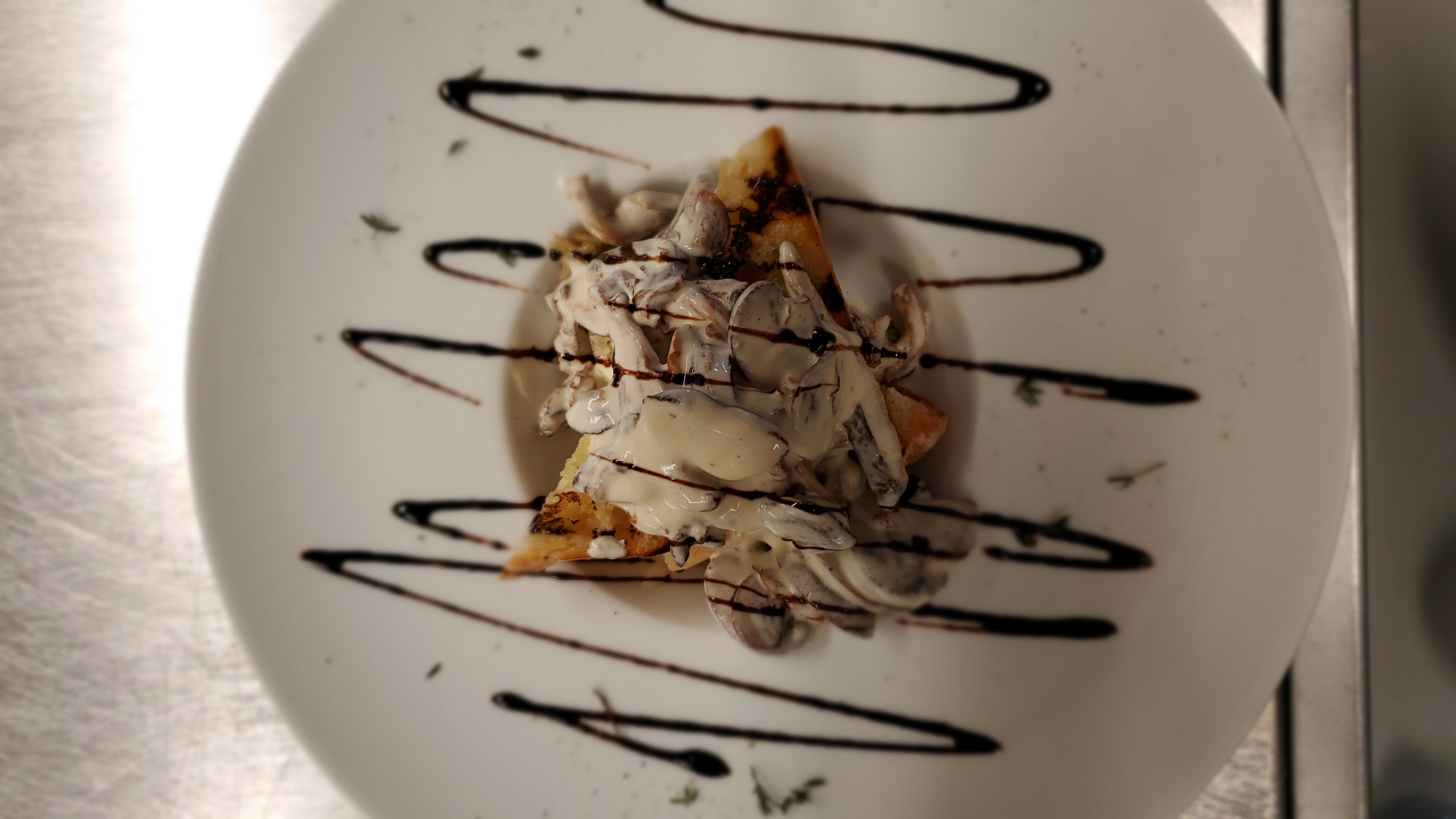 This isnt a regular on our menu but something we ran as an appetizer for our County's restaurant week. Crispy wild mushrooms, tossed in creme fraiche we make in house, pilled up on garlic rubbed grilled bread, with a balsamic vinegar reduction, fresh thyme, cracked pepper and some pink Himalayan seasalt.