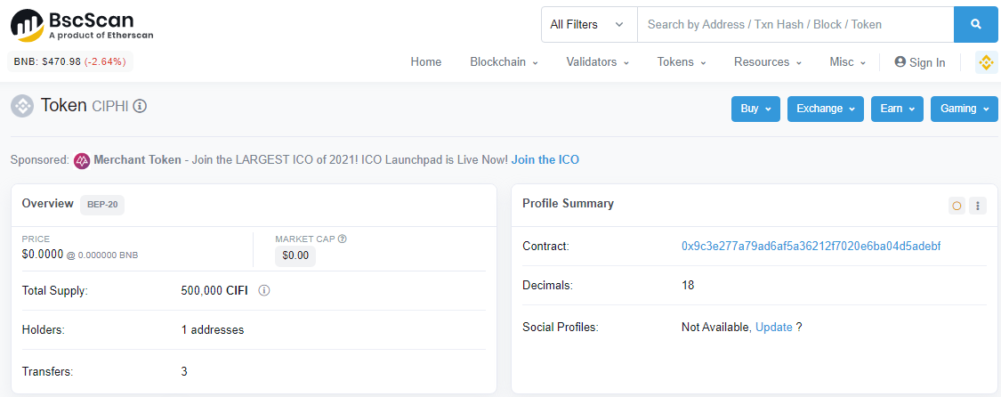 The Citizen Finance project has created a token that will be used on the gaming platform. This token is called CIPHI. The CIPHI token is created on the Binance Smart Chain and has a total supply of 500,000 tokens.