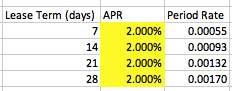 |0.10| == desired interest rate. Please note -- that this is the rate of interest over the period, and not the entire year and it also takes 3 days to unstake at the end of the lease. So for example, if I wanted a 2% APR, I'd use the following period rates: