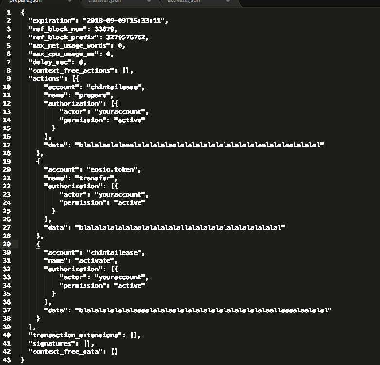 Now we need to add the actions for transfer.json and activate.json to this file. In the end, the prepare.json will contain all 3 actions and will look like this: