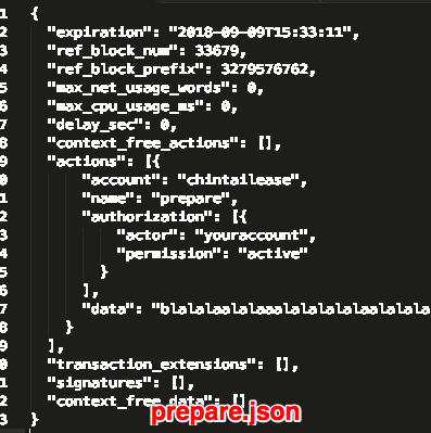 cleos -u https://api.eosdetroit.io:443 push action chintailease prepare '{"memo":"youraccount|0|20.0000|0.10|7|randomnumbers"}' -d -j -s -p youraccount > prepare.json