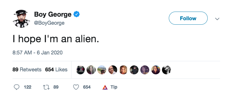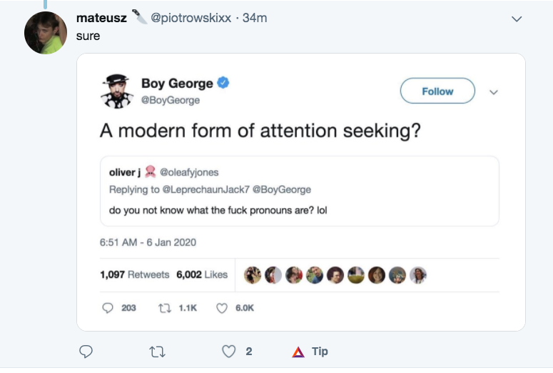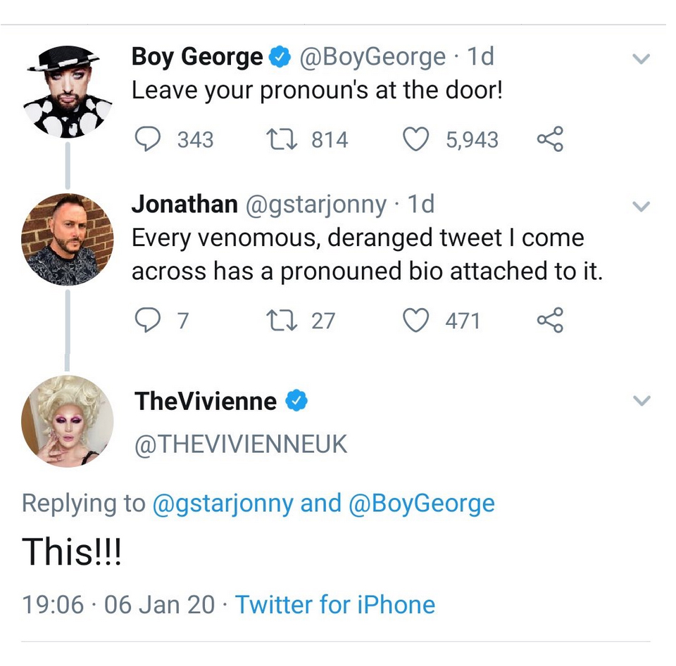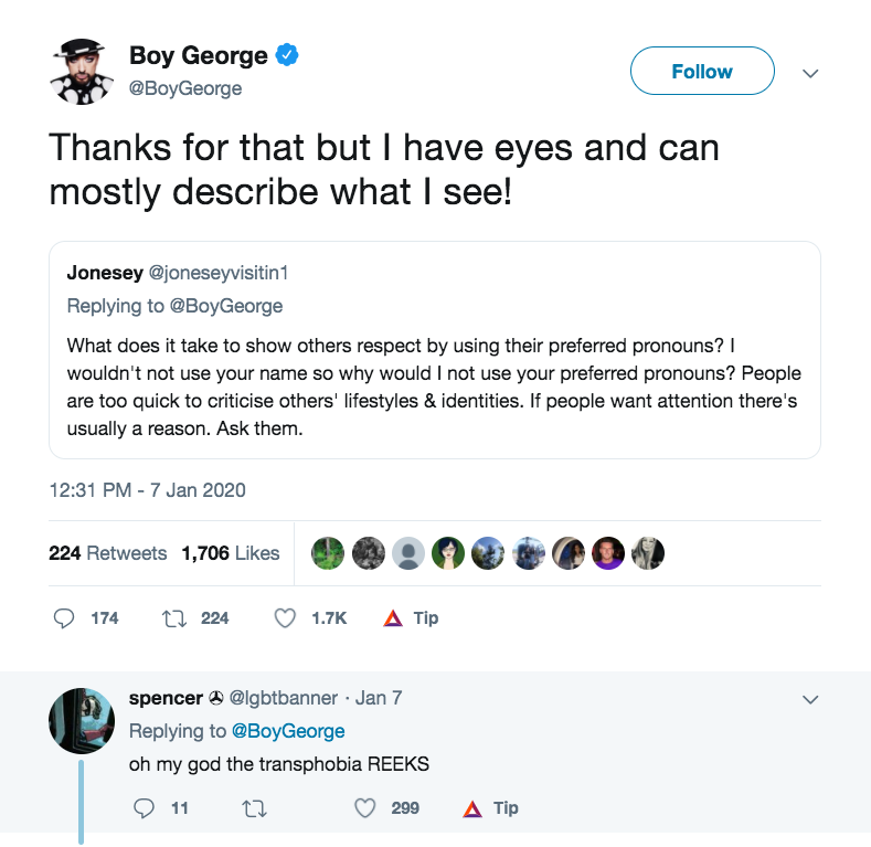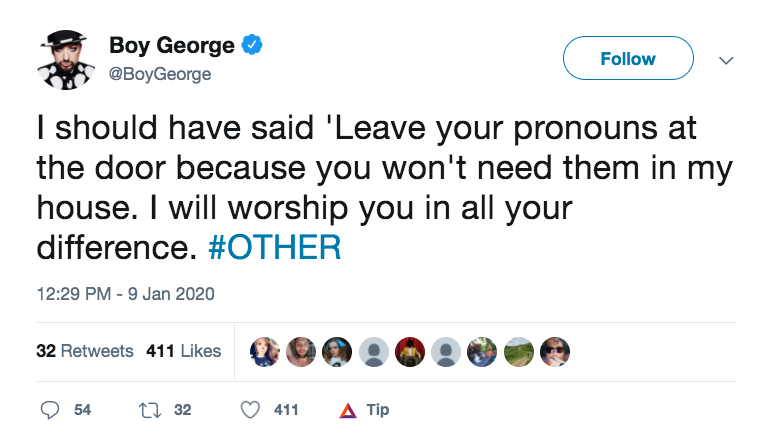 Yes, BOY GEORGE, father of the genderqueer movement, wearer of granny shirts, feathered hair and terrible 80s makeup. Arguably one of the more iconic celebrities who actually didn't give a fuck about the concept of masculine and feminine.