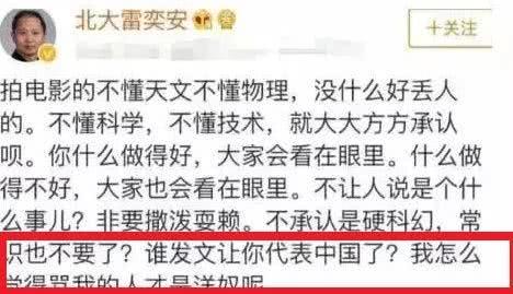 1北大教授就在网上发文吐槽,不懂天文地理,不懂科学技术,大方承认就好了!不承认这部电影是硬科幻,一点都没有常识!还直言是谁让你代表中国?言辞之中满是愤怒!