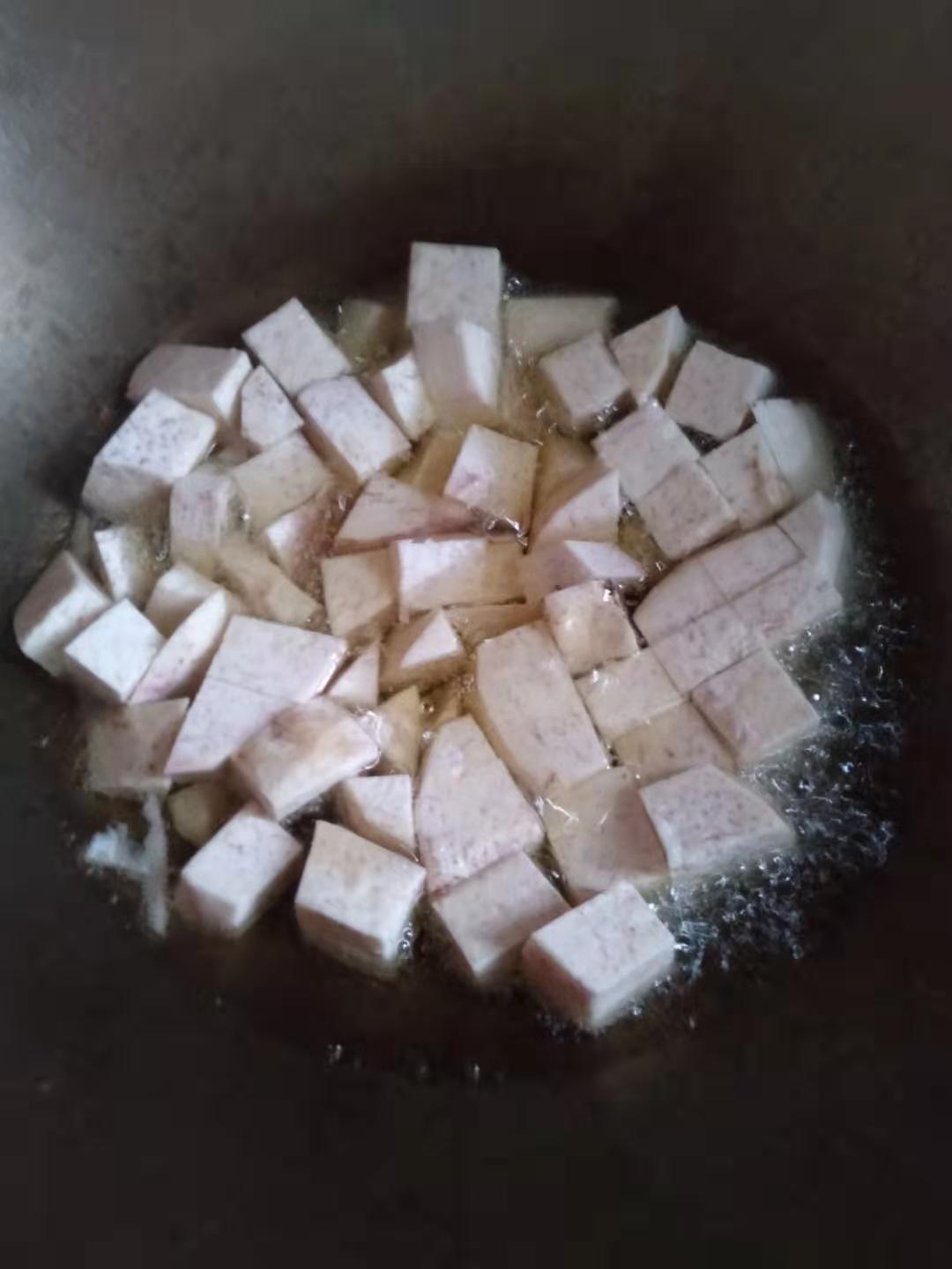 - 芋头要先切成骰子那么大就好。放点油炸输后放到大米饭里闷一下。