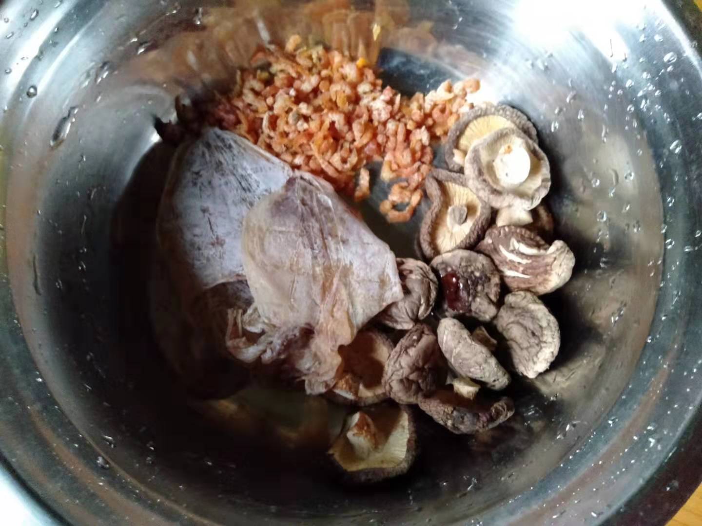 - 香菇,虾仁,小鱿鱼要泡温水,香菇和小鱿鱼泡好之后切成丝。