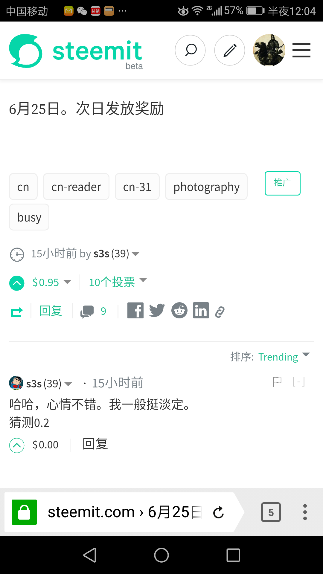 You are viewing a single comment's thread from:RE: 6月25日 心情日志View the full contextdavidke20 (74)in #cn • 8 years ago @tipu @tipu upvote this post with 0.9 SBD now! now! now!