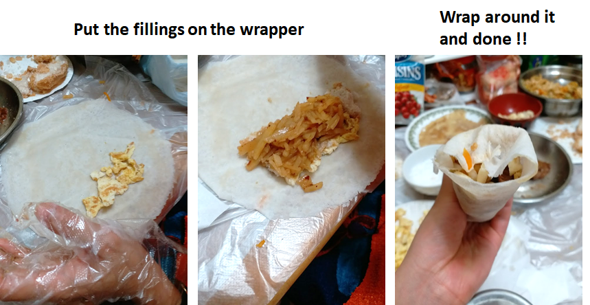 This is how we make Fujian style spring-pancake at home. The filling might be different from others. My mom usually make what we already have in the fridge.