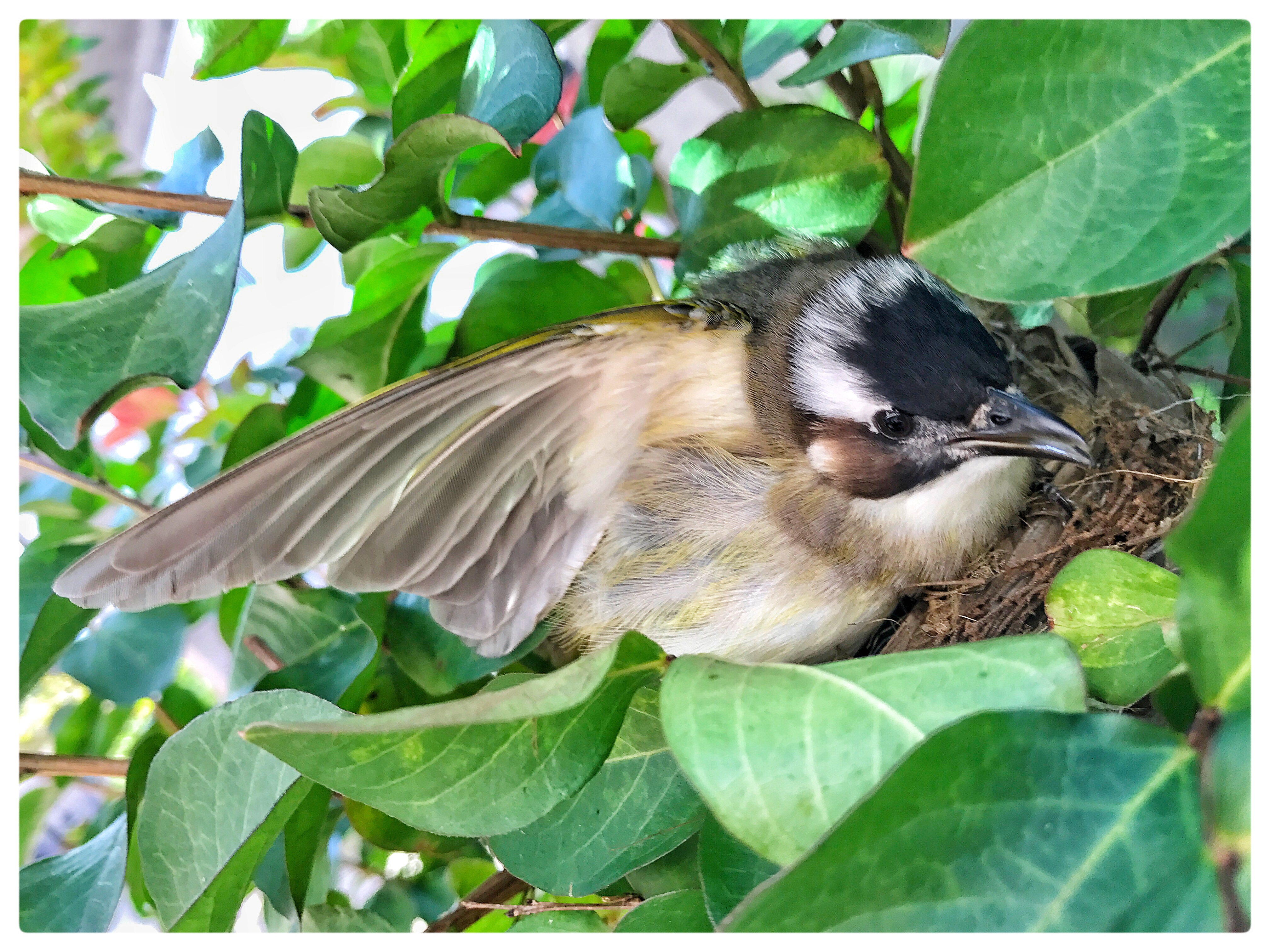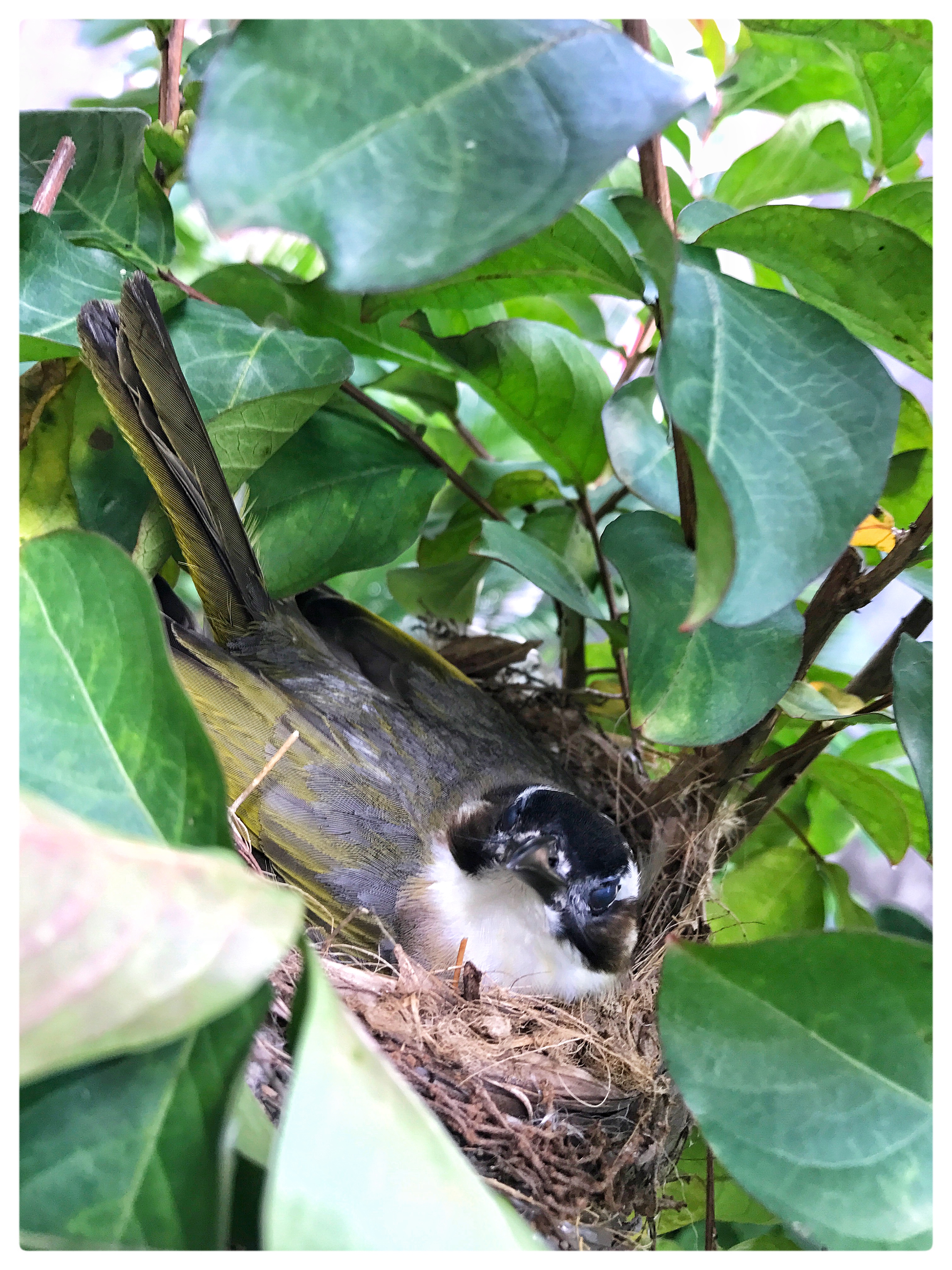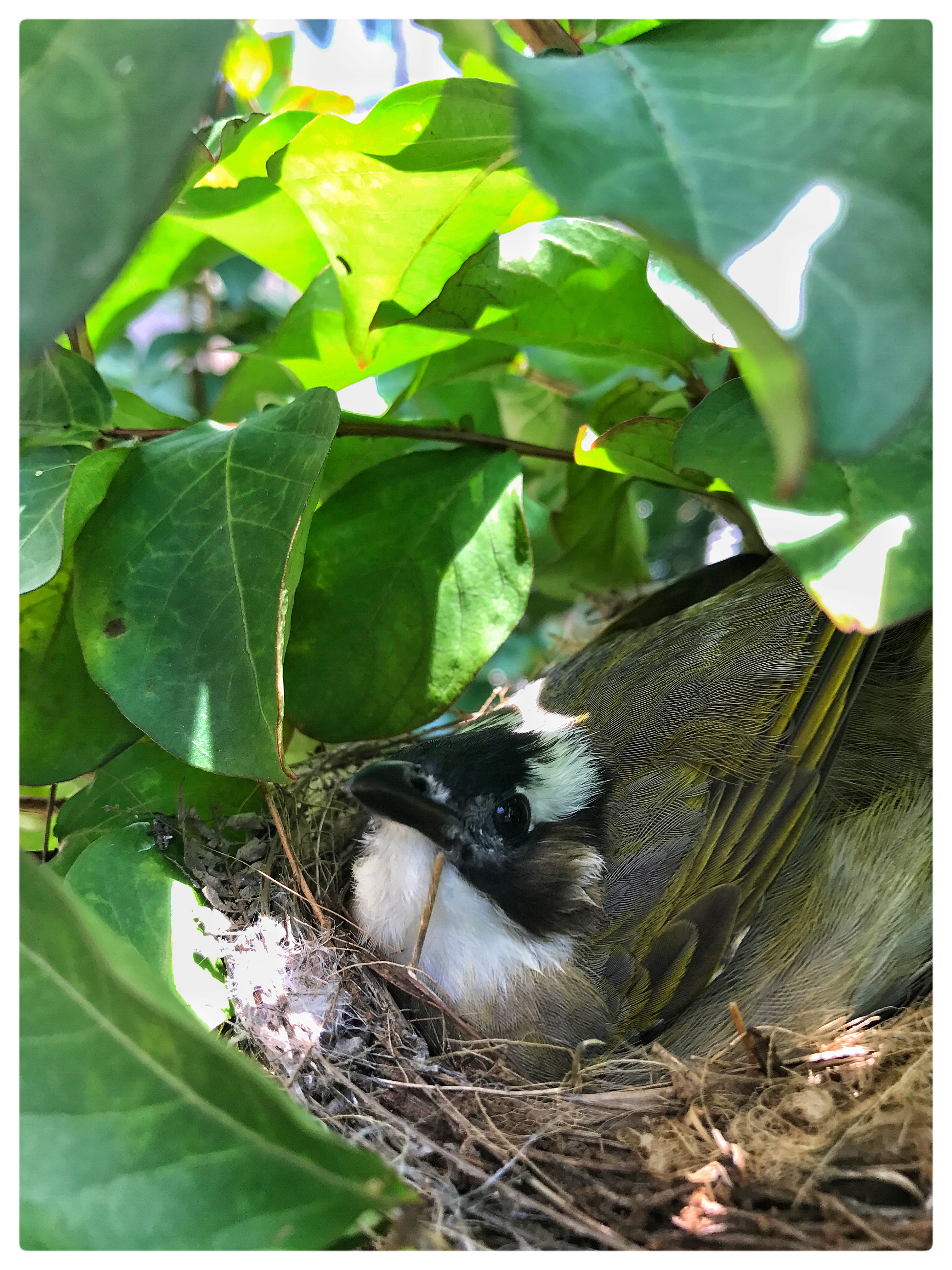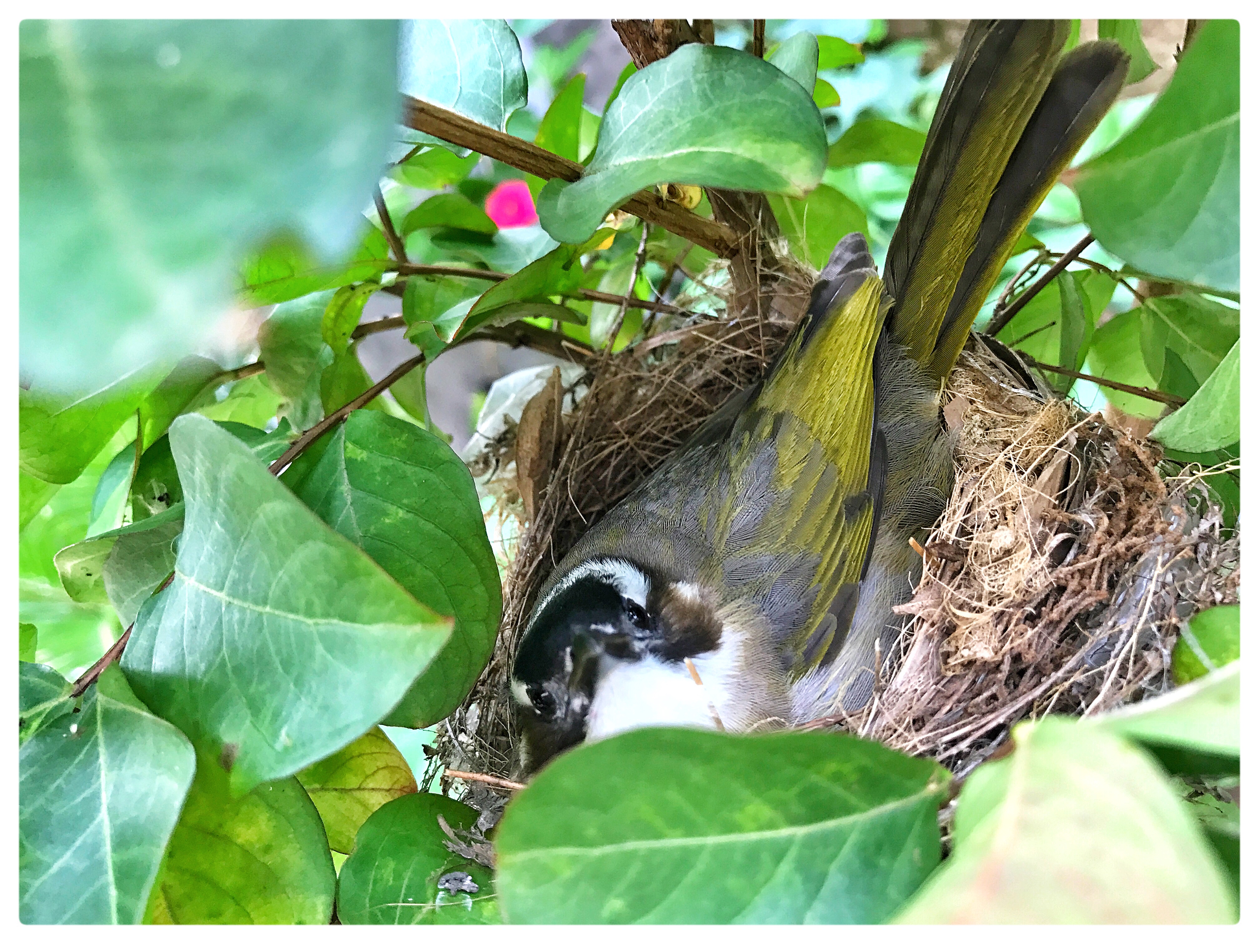 转了近一个小时,又回到鸟窝边,发现有一只白头鹎在窝里。我想白头鹎比较不畏人,就靠近拍,到了鸟窝上方,白头鹎先是发声伸出尖嘴警告我,我没理继续拍。一会儿小鸟飞走了,留下巢里的3颗小鸟蛋。