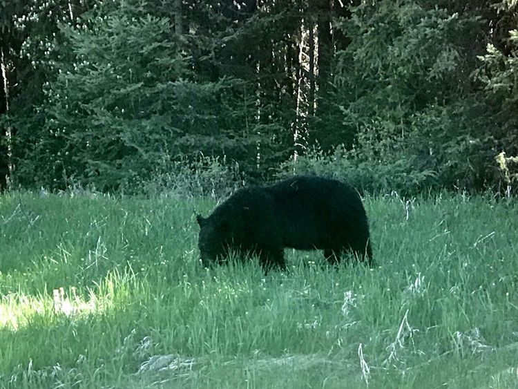 在返回途中看到公路旁边的黑熊。我们没敢下车,隔着车窗玻璃拍下熊影。也有胆大的,下车悄悄地移动,就近拍摄。这里的熊大概已经习惯了被关注,或无大碍,仍然慢不经心低头寻找什么。