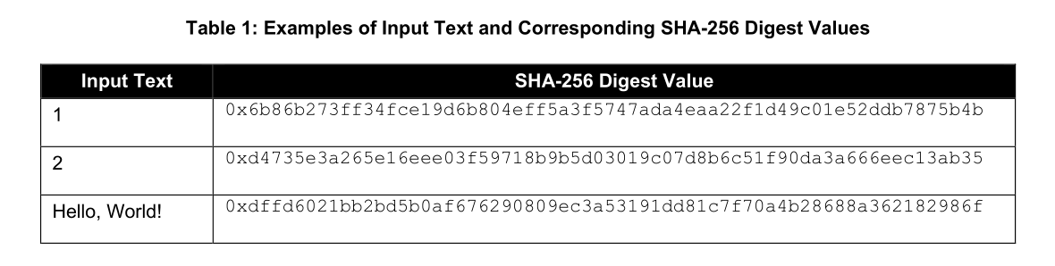 作为在许多区块链应用中被使用的密码哈希函数,安全哈希算法(SHA)输出长度为256位的结果(SHA-256)。许多计算机硬件上支持这种算法,可以加快计算速度。SHA-256输出结果为32字节,通常显示为一个64位的十六进制字符串。这意味着存在2256,约等于1077,即115,792,089,237,316,195,423,570,985,008,687,907,853,269,984,665,640,564,039,457,584,007,913,129,639,936种可能的输出值。SHA-256哈希算法还有其他一些哈希算法都是经过联邦信息处理标准认定的安全哈希算法,美国国标局网站上有所有认定过的安全哈希算法。