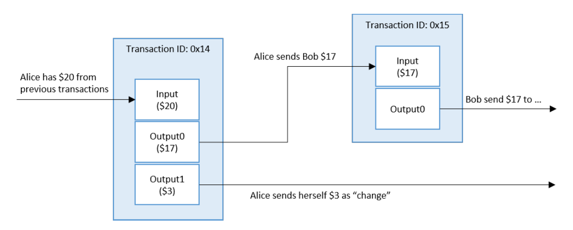 输出——通常指接收方账户以及即将接收多少数字资产。每个交易输出都包含了新用户即将获得的数字资产的具体数额,新用户的ID以及花费这些资产所需要的条件。如果转移过程中数字资产供大于求,多出来的部分将被返还到发送方的账户(“找零”机制)。(译者注:其实这是UTXO模式,账户模式的并非如此)