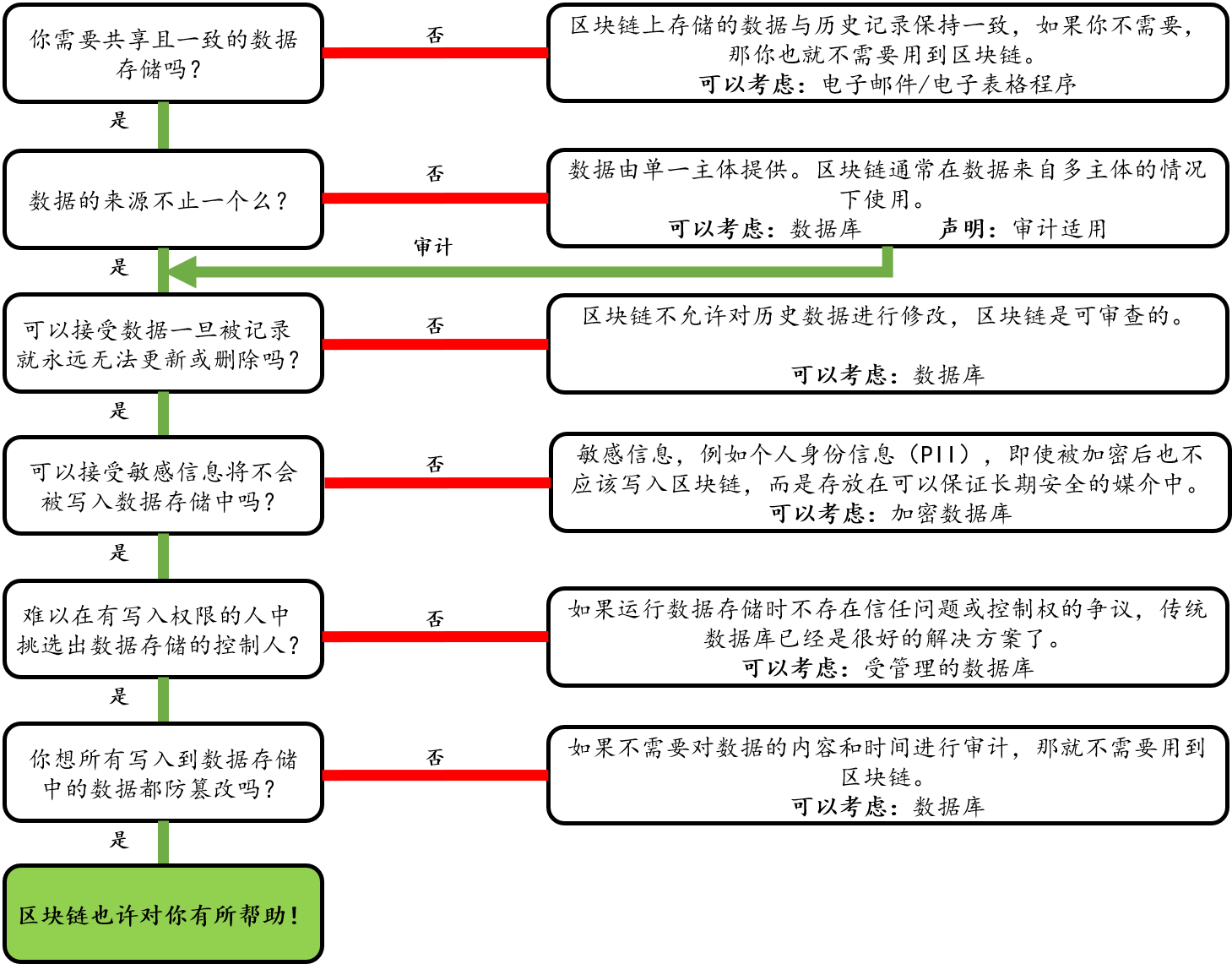 美国国土安全部(DHS)下属的科技署对区块链技术开展了相关研究并绘制了一幅流程图,帮助判断是否有为了自身发展而引入区块链的需要。在获得允许后,我们对该流程图进行一些调整,详见下图。