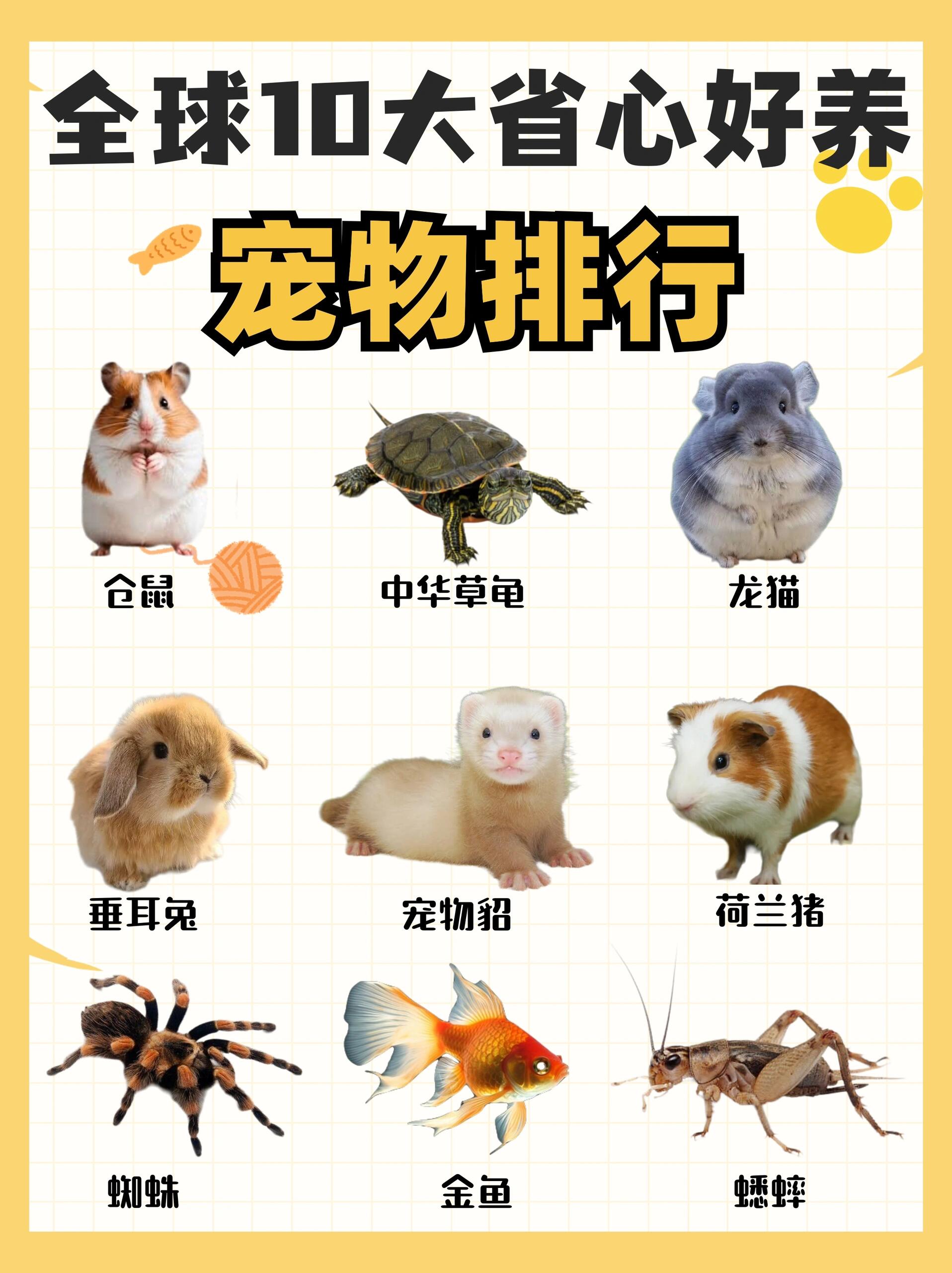 1、仓鼠,2、中华草龟,3、龙猫,4、宠物貂,5、荷兰猪,6、长耳兔,7、金鱼,8、蜘蛛,9、蟋蟀