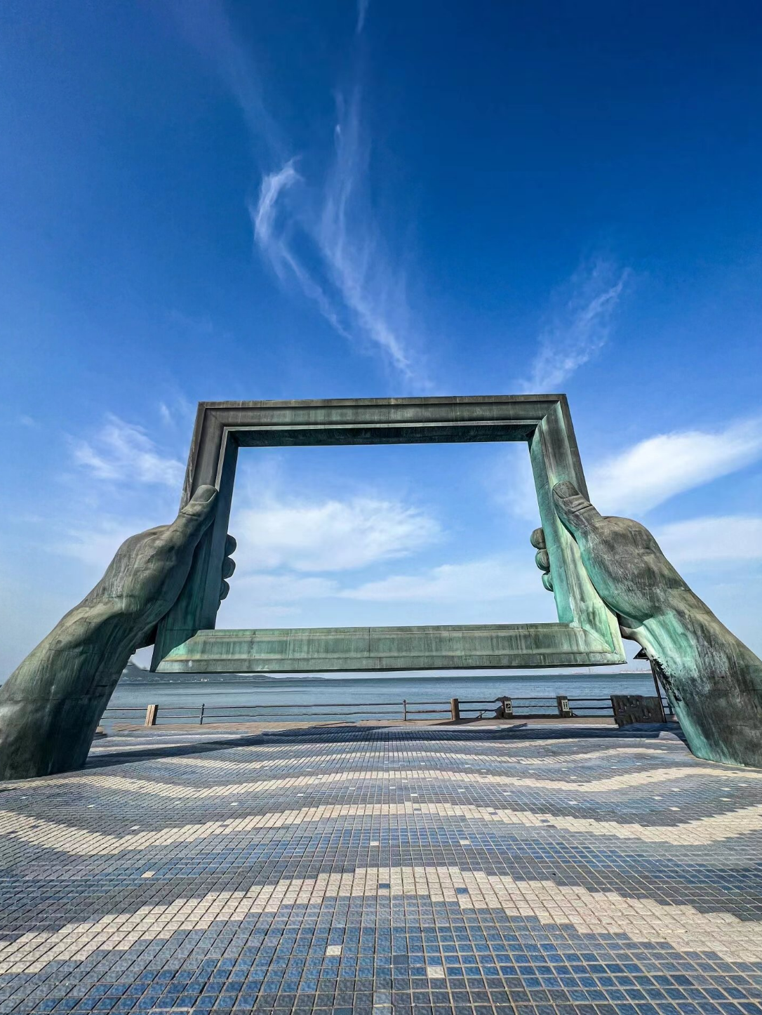 这里有威海地标性建筑一大相框回,人在相框里,背后是蓝色的大海。