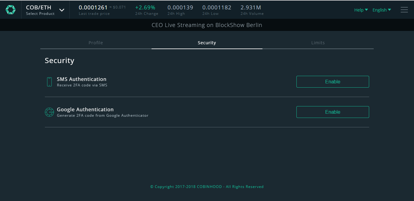 Cobinhood encourages users to enable two factor authentication on their account. This is to ensure maximum security on user accounts