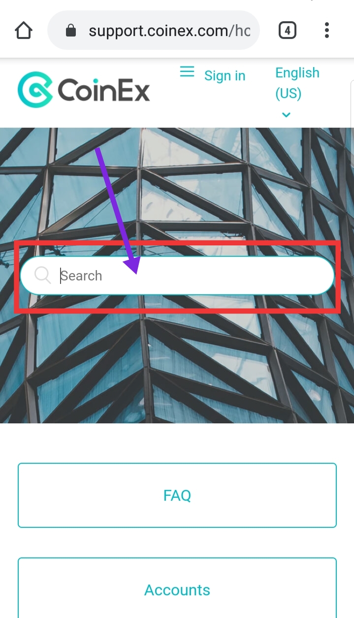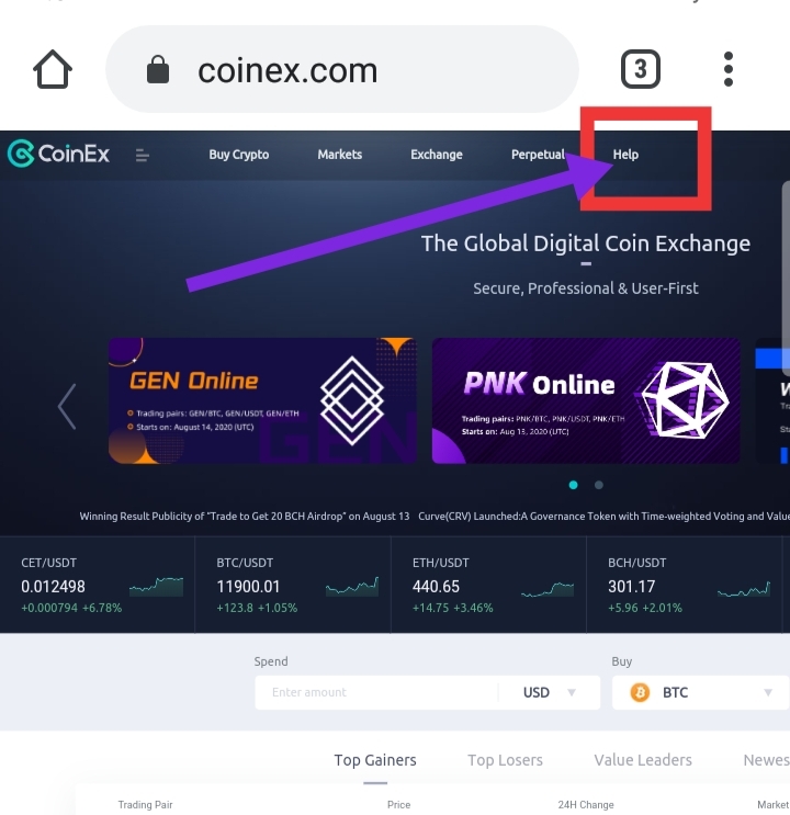 Go to CoinEx website www.coinex.com and click "Help" at the top.