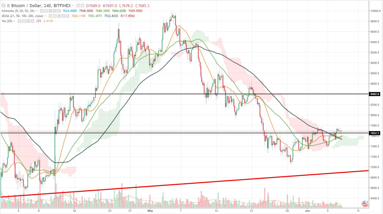 Resistance line breakout again at $7,650Ichimoku cloud breakoutTriple Golden cross formed: 21, 50, 100 day moving averageBut, still cannot find a large volume coming in.