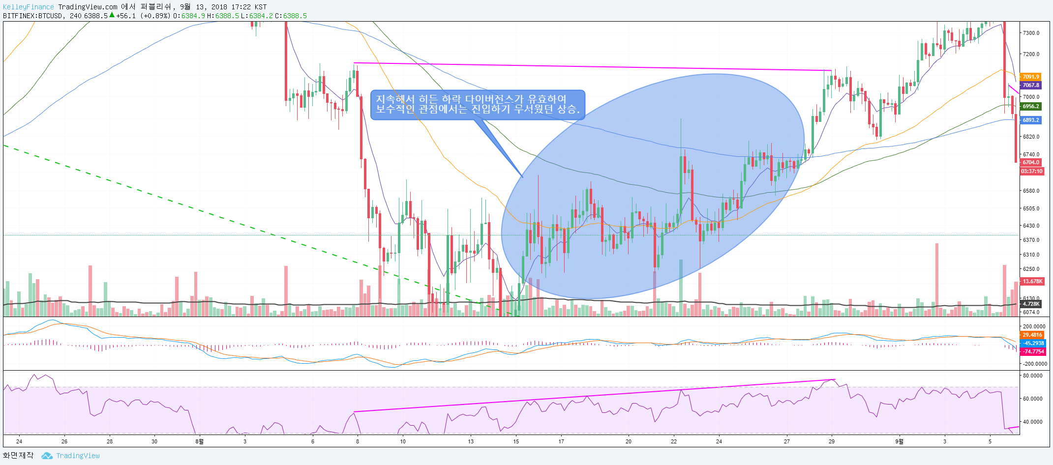 지속해서 히든 하락 다이버전스가 유효하여 보수적인 관점에서는 진입하기 무서웠던 상승입니다.