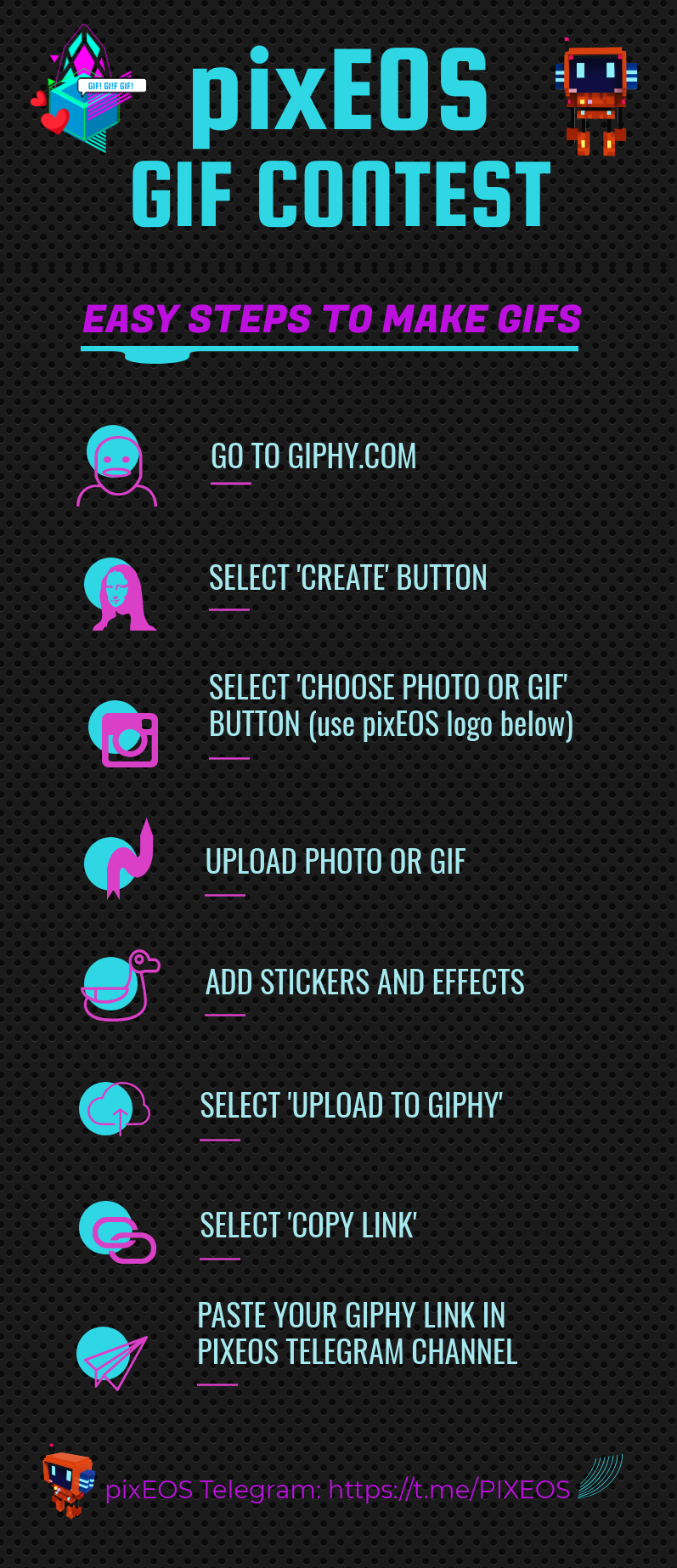 반드시 pixsEOS 공식 텔레그램 채널인 https://t.me/PIXEOS에서 GIF 와 SNS에 올린 링크를 제출해야 합니다.