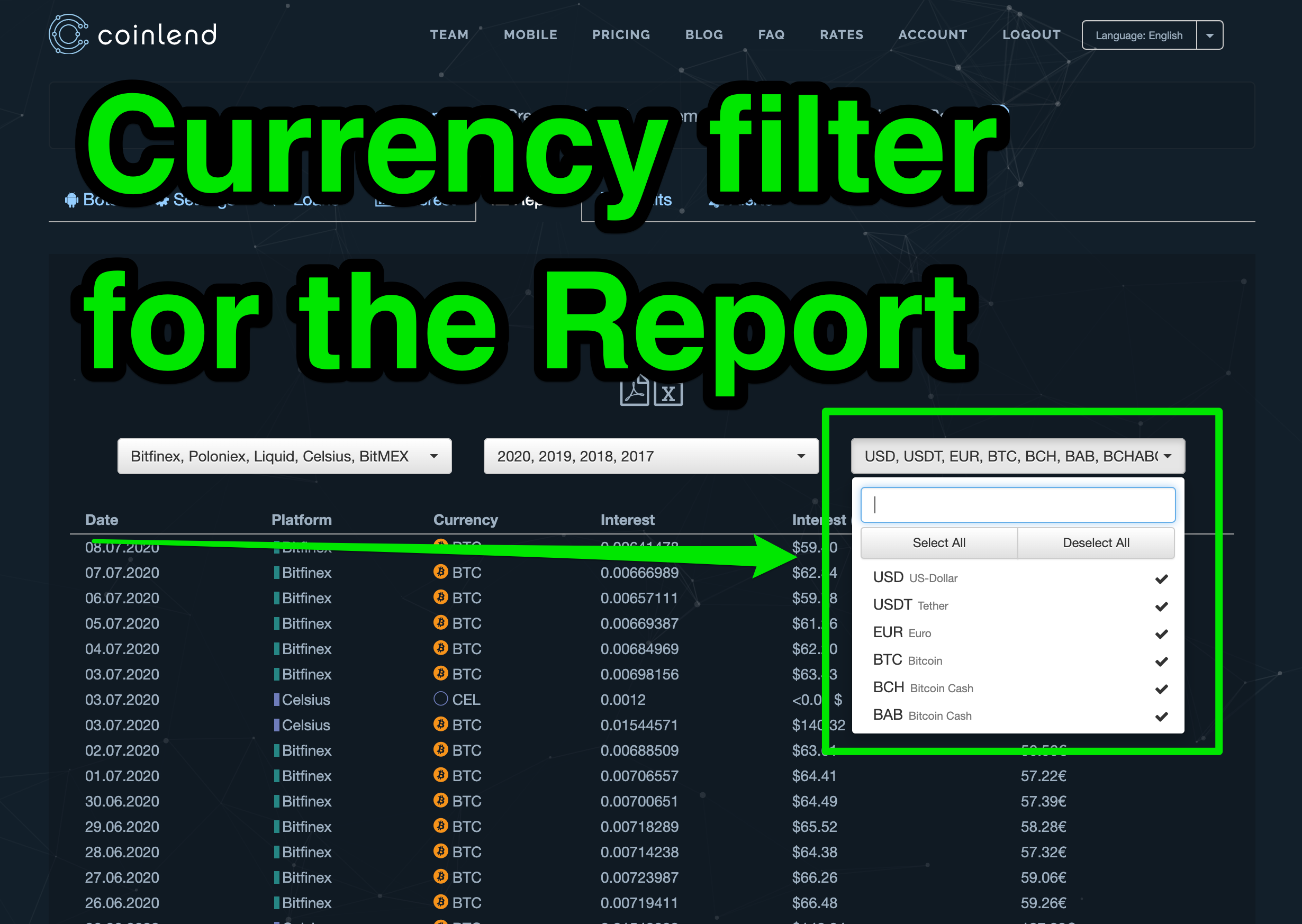 Currency filter for the Coinlend reportcoinlend (55)in #coinlend • 6 years ago We implemented a new feature for the report section: You now can filter your interest payments not only by year and platform, but also by currencies: